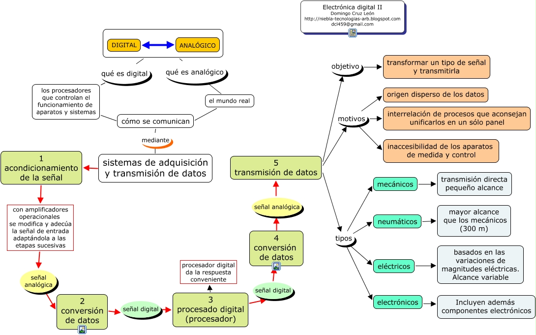 Este Cmap, tiene información relacionada con: electrónica digital II, 2 conversión de datos señal digital 3 procesado digital (procesador), 5 transmisión de datos objetivo transformar un tipo de señal y transmitirla, qué es analógico el mundo real, 5 transmisión de datos motivos inaccesibilidad de los aparatos de medida y control, 3 procesado digital (procesador) procesador digital da la respuesta conveniente, 3 procesado digital (procesador) señal digital 4 conversión de datos, mecánicos transmisión directa pequeño alcance, 5 transmisión de datos motivos interrelación de procesos que aconsejan unificarlos en un sólo panel, 5 transmisión de datos tipos eléctricos, con amplificadores operacionales se modifica y adecúa la señal de entrada adaptándola a las etapas sucesivas señal analógica 2 conversión de datos, neumáticos mayor alcance que los mecánicos (300 m), 5 transmisión de datos tipos neumáticos, 5 transmisión de datos tipos mecánicos, 5 transmisión de datos motivos origen disperso de los datos, 1 acondicionamiento de la señal con amplificadores operacionales se modifica y adecúa la señal de entrada adaptándola a las etapas sucesivas, electrónicos Incluyen además componentes electrónicos, los procesadores que controlan el funcionamiento de aparatos y sistemas cómo se comunican, eléctricos basados en las variaciones de magnitudes eléctricas. Alcance variable, sistemas de adquisición y transmisión de datos 1 acondicionamiento de la señal, cómo se comunican mediante sistemas de adquisición y transmisión de datos