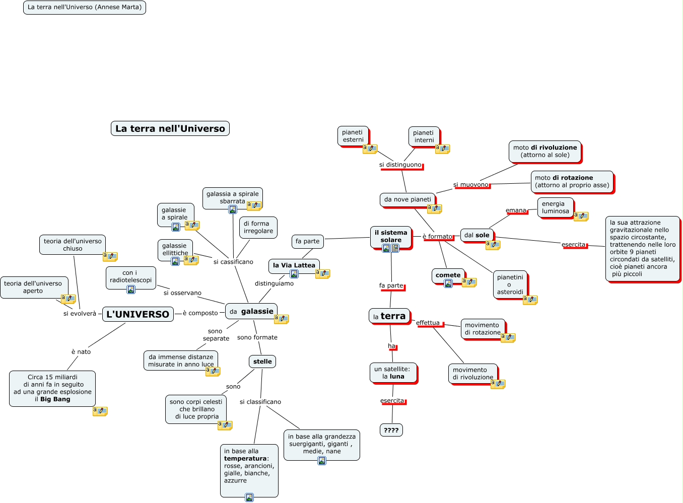 Questa Cmap, creata con IHMC CmapTools, contiene informazioni relative a: la terra nell' universo ( Annese marta 3^c), da galassie si cassificano galassie a spirale, stelle si classificano in base alla temperatura: rosse, arancioni, gialle, bianche, azzurre, L'UNIVERSO si evolverà teoria dell'universo aperto, da galassie si osservano con i radiotelescopi, la terra effettua movimento di rivoluzione, il sistema solare è formato comete, da galassie si cassificano galassia a spirale sbarrata, il sistema solare è formato pianetini o asteroidi, L'UNIVERSO si evolverà teoria dell'universo chiuso, il sistema solare fa parte la terra, un satellite: la luna esercita ????, il sistema solare è formato dal sole, da galassie si cassificano galassie ellittiche, stelle si classificano in base alla grandezza suergiganti, giganti , medie, nane, stelle sono sono corpi celesti che brillano di luce propria, la Via Lattea il sistema solare, da nove pianeti si muovono moto di rotazione (attorno al proprio asse), da nove pianeti si distinguono pianeti esterni, dal sole esercita la sua attrazione gravitazionale nello spazio circostante, trattenendo nelle loro orbite 9 pianeti circondati da satelliti, cioè pianeti ancora più piccoli, il sistema solare è formato da nove pianeti