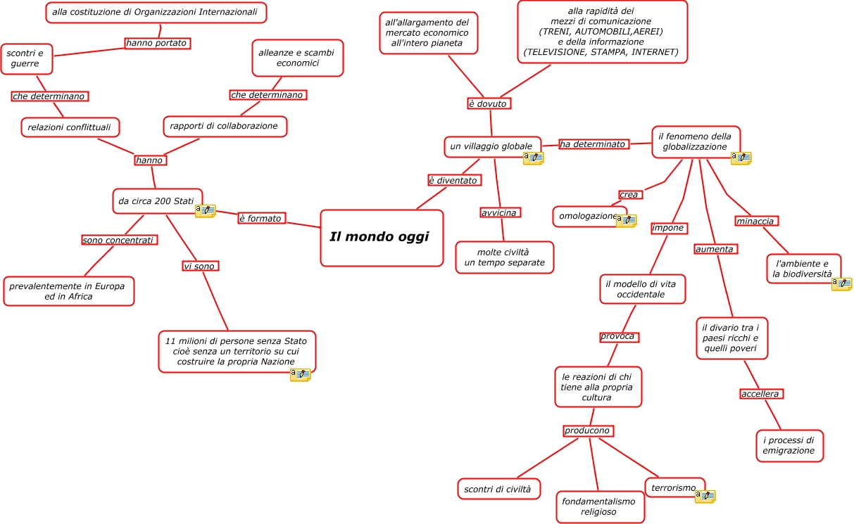 Questa Cmap, creata con IHMC CmapTools, contiene informazioni relative a: il mondo oggi ( Annese Marta 3^c), fondamentalismo religioso producono le reazioni di chi tiene alla propria cultura, alla rapidità dei mezzi di comunicazione (TRENI, AUTOMOBILI,AEREI) e della informazione (TELEVISIONE, STAMPA, INTERNET) è dovuto un villaggio globale, all'allargamento del mercato economico all'intero pianeta è dovuto un villaggio globale, terrorismo producono le reazioni di chi tiene alla propria cultura, omologazione crea il fenomeno della globalizzazione, l'ambiente e la biodiversità minaccia il fenomeno della globalizzazione, molte civiltà un tempo separate avvicina un villaggio globale, alla costituzione di Organizzazioni Internazionali hanno portato scontri e guerre, scontri e guerre che determinano relazioni conflittuali, relazioni conflittuali hanno da circa 200 Stati, alleanze e scambi economici che determinano rapporti di collaborazione, un villaggio globale è diventato Il mondo oggi, un villaggio globale ha determinato il fenomeno della globalizzazione, 11 milioni di persone senza Stato cioè senza un territorio su cui costruire la propria Nazione vi sono da circa 200 Stati, prevalentemente in Europa ed in Africa sono concentrati da circa 200 Stati, rapporti di collaborazione hanno da circa 200 Stati, i processi di emigrazione accellera il divario tra i paesi ricchi e quelli poveri, il divario tra i paesi ricchi e quelli poveri aumenta il fenomeno della globalizzazione, le reazioni di chi tiene alla propria cultura provoca il modello di vita occidentale, il modello di vita occidentale impone il fenomeno della globalizzazione
