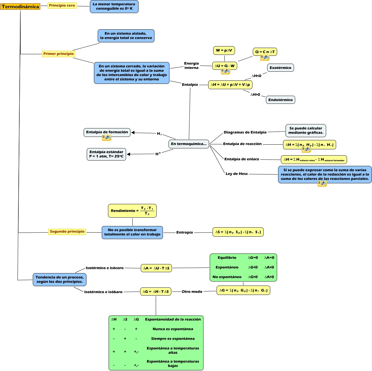bajas </mtext> </mtd> </mtr> </mtable> </mrow> </math>, Termodinámica Segundo principio, ΔU = Q - W Q = C n ΔT, En termoquímica... Ley de Hess Si se puede expresar como la suma de varias reacciones, el calor de la redacción es igual a la suma de los calores de las reacciones parciales., No es posible transformar totalmente el calor en trabajo <math xmlns="http://www.w3.org/1998/Math/MathML"> <mrow> <mtext> Rendimiento = </mtext> <mfrac> <mrow> <mmultiscripts> <mtext> T </mtext> <mtext> 2 </mtext> <none/> </mmultiscripts> <mtext> - </mtext> <mmultiscripts> <mtext> T </mtext> <mtext> 1 </mtext> <none/> </mmultiscripts> </mrow> <mmultiscripts> <mtext> T </mtext> <mtext> 2 </mtext> <none/> </mmultiscripts> </mfrac> </mrow> </math>, En un sistema cerrado, la variación de energía total es igual a la suma de los intercambios de calor y trabajo entre el sistema y su entorno Entalpía ΔH = ΔU + pΔV + VΔp, ΔH = ΔU + pΔV + VΔp ΔHɬ Endotérmico, Principio cero La menor temperatura conseguible es 0º K, No es posible transformar totalmente el calor en trabajo Entropía <math xmlns="http://www.w3.org/1998/Math/MathML"> <mtext> ΔS = </mtext> <mrow> <mtext> Σ( </mtext> <mmultiscripts> <mtext> n </mtext> <mtext> p </mtext> <none/> </mmultiscripts> <mtext> </mtext> <mmultiscripts> <mtext> S </mtext> <mtext> p </mtext> <none/> </mmultiscripts> <mtext> ) - Σ( </mtext> <mmultiscripts> <mtext> n </mtext> <mtext> r </mtext> <none/> </mmultiscripts> <mtext> </mtext> <mmultiscripts> <mtext> S </mtext> <mtext> r </mtext> <none/> </mmultiscripts> <mtext> ) </mtext> </mrow> </math>, Segundo principio No es posible transformar totalmente el calor en trabajo, <math xmlns="http://www.w3.org/1998/Math/MathML"> <mtext> ΔA = </mtext> <mtext> ΔU - T </mtext> <mtext> ΔS </mtext> </math> <math xmlns="http://www.w3.org/1998/Math/MathML"> <mrow> <mtable> <mtr> <mtd> <mtext> Equilibrio </mtext> </mtd> <mtd> <mrow> <mtext> ΔG=0 </mtext> </mrow> </mtd> <mtd> <mrow> <mtext> ΔA=0 </mtext> </mrow> </mtd> </mtr> <mtr> <mtd> <mtext> Espontáneo </mtext> </mtd> <mtd> <mrow> <mtext> ΔG<0 </mtext> </mrow> </mtd> <mtd> <mrow> <mtext> ΔA<0 </mtext> </mrow> </mtd> </mtr> <mtr> <mtd> <mtext> No espontáneo </mtext> </mtd> <mtd> <mrow> <mtext> ΔG>0 </mtext> </mrow> </mtd> <mtd> <mrow> <mtext> ΔA>0 </mtext> </mrow> </mtd> </mtr> </mtable> </mrow> </math>, <math xmlns="http://www.w3.org/1998/Math/MathML"> <mrow> <mtext> ΔG = </mtext> <mrow> <mtext> Σ( </mtext> <mmultiscripts> <mtext> n </mtext> <mtext> p </mtext> <none/> </mmultiscripts> <mtext> </mtext> <mmultiscripts> <mtext> G </mtext> <mtext> p </mtext> <none/> </mmultiscripts> <mtext> ) - Σ( </mtext> <mmultiscripts> <mtext> n </mtext> <mtext> r </mtext> <none/> </mmultiscripts> <mtext> </mtext> <mmultiscripts> <mtext> G </mtext> <mtext> r </mtext> <none/> </mmultiscripts> <mtext> ) </mtext> </mrow> </mrow> </math> <math xmlns="http://www.w3.org/1998/Math/MathML"> <mrow> <mtable> <mtr> <mtd> <mtext> Equilibrio </mtext> </mtd> <mtd> <mrow> <mtext> ΔG=0 </mtext> </mrow> </mtd> <mtd> <mrow> <mtext> ΔA=0 </mtext> </mrow> </mtd> </mtr> <mtr> <mtd> <mtext> Espontáneo </mtext> </mtd> <mtd> <mrow> <mtext> ΔG<0 </mtext> </mrow> </mtd> <mtd> <mrow> <mtext> ΔA<0 </mtext> </mrow> </mtd> </mtr> <mtr> <mtd> <mtext> No espontáneo </mtext> </mtd> <mtd> <mrow> <mtext> ΔG>0 </mtext> </mrow> </mtd> <mtd> <mrow> <mtext> ΔA>0 </mtext> </mrow> </mtd> </mtr> </mtable> </mrow> </math>, ΔU = Q - W W = pΔV, Termodinámica Principio cero, Termodinámica Primer principio, En un sistema cerrado, la variación de energía total es igual a la suma de los intercambios de calor y trabajo entre el sistema y su entorno Energía interna ΔU = Q - W