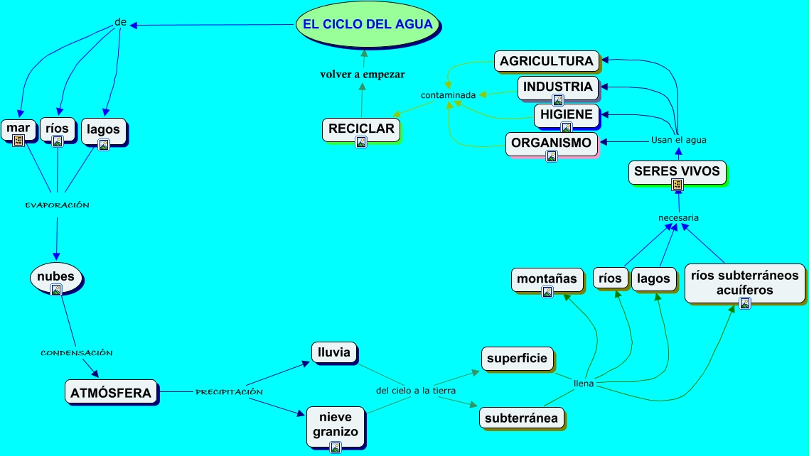 Este Cmap, tiene información relacionada con: CICLO DEL AGUA (OTRO MAPA), lluvia del cielo a la tierra subterránea, SERES VIVOS Usan el agua INDUSTRIA, superficie llena montañas, ATMÓSFERA PRECIPITACIÓN lluvia, subterránea llena lagos, superficie llena ríos, INDUSTRIA contaminada RECICLAR, HIGIENE contaminada RECICLAR, subterránea llena montañas, subterránea llena ríos, superficie llena lagos, lagos EVAPORACIÓN nubes, SERES VIVOS Usan el agua ORGANISMO, ORGANISMO contaminada RECICLAR, ATMÓSFERA PRECIPITACIÓN nieve granizo, AGRICULTURA contaminada RECICLAR, ríos EVAPORACIÓN nubes, mar EVAPORACIÓN nubes, lluvia del cielo a la tierra superficie, SERES VIVOS Usan el agua HIGIENE