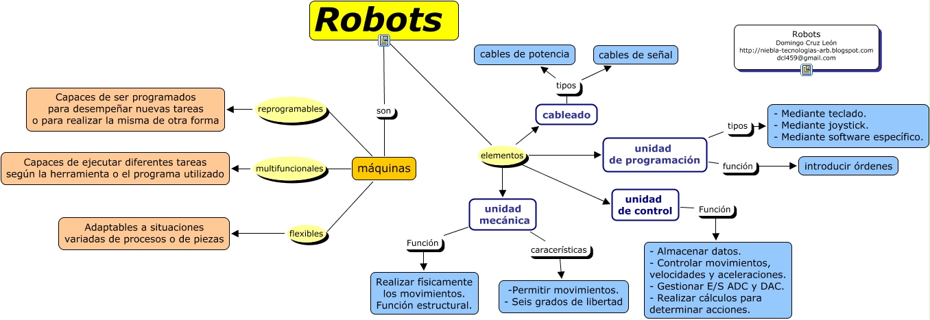 Este Cmap, tiene información relacionada con: robots, máquinas reprogramables Capaces de ser programados para desempeñar nuevas tareas o para realizar la misma de otra forma, unidad mecánica caracerísticas -Permitir movimientos. - Seis grados de libertad, cableado tipos cables de señal, unidad mecánica Función Realizar físicamente los movimientos. Función estructural., máquinas flexibles Adaptables a situaciones variadas de procesos o de piezas, máquinas multifuncionales Capaces de ejecutar diferentes tareas según la herramienta o el programa utilizado, Robots son máquinas, Robots elementos unidad mecánica, Robots elementos unidad de control, unidad de programación tipos - Mediante teclado. - Mediante joystick. - Mediante software específico., unidad de control Función - Almacenar datos. - Controlar movimientos, velocidades y aceleraciones. - Gestionar E/S ADC y DAC. - Realizar cálculos para determinar acciones., Robots elementos unidad de programación, Robots elementos cableado, cableado tipos cables de potencia, unidad de programación función introducir órdenes