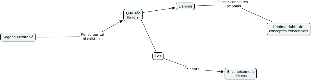 Este Cmap, tiene información relacionada con: Segona meditació, Cos Sentits El coneixement del cos, L'anima Pensar conceptes Racionals L'anima dubta de conceptes existencials, Que sóc llavors ???? Cos, Que sóc llavors ???? L'anima, Segona Meditació Penso per tal hi existeixo Que sóc llavors