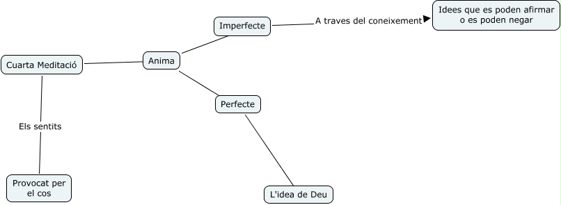 Este Cmap, tiene información relacionada con: cuarta meditació, Cuarta Meditació ???? Anima, Anima ???? Imperfecte, Anima ???? Perfecte, Imperfecte A traves del coneixement Idees que es poden afirmar o es poden negar, Perfecte ???? L'idea de Deu, Cuarta Meditació Els sentits Provocat per el cos