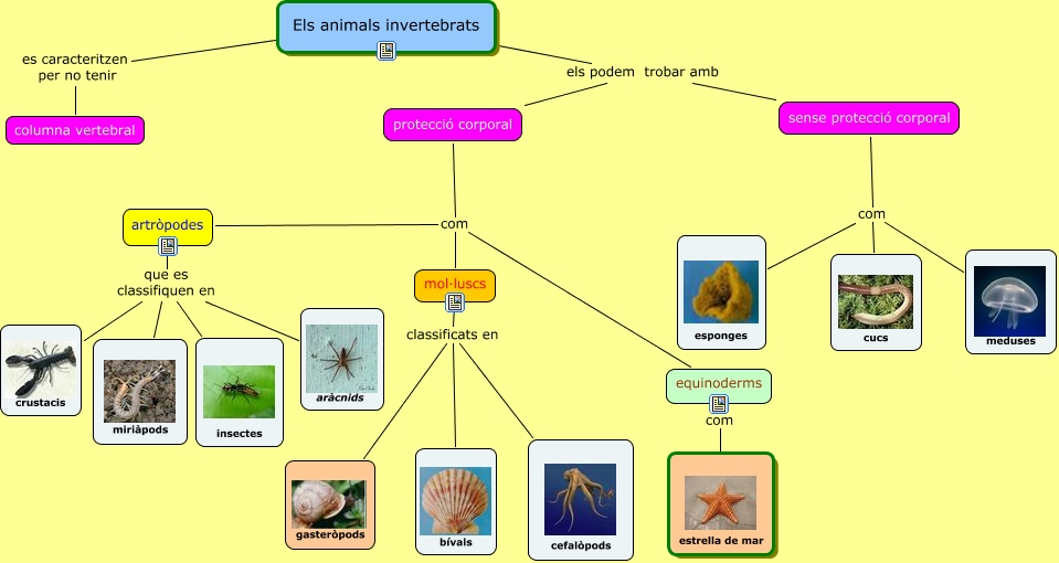 Este Cmap, tiene información relacionada con: PRESENTACIÓ invertebrats, Els animals invertebrats els podem trobar amb protecció corporal, Els animals invertebrats els podem trobar amb sense protecció corporal, equinoderms com estrella de mar, sense protecció corporal com meduses, artròpodes que es classifiquen en insectes, sense protecció corporal com cucs, protecció corporal com equinoderms, mol·luscs classificats en bívals, artròpodes que es classifiquen en miriàpods, Els animals invertebrats es caracteritzen per no tenir columna vertebral, sense protecció corporal com esponges, artròpodes que es classifiquen en aràcnids, mol·luscs classificats en gasteròpods, mol·luscs classificats en cefalòpods, protecció corporal com artròpodes, protecció corporal com mol·luscs, artròpodes que es classifiquen en crustacis