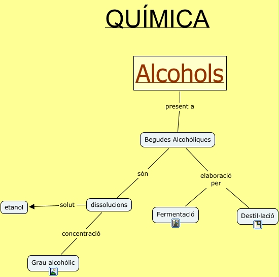 Este Cmap, tiene información relacionada con: quimica_alcohol, Begudes Alcohòliques elaboració per Fermentació, Alcohols present a Begudes Alcohòliques, Begudes Alcohòliques són dissolucions, dissolucions solut etanol, Begudes Alcohòliques elaboració per Destil·lació, dissolucions concentració Grau alcohòlic