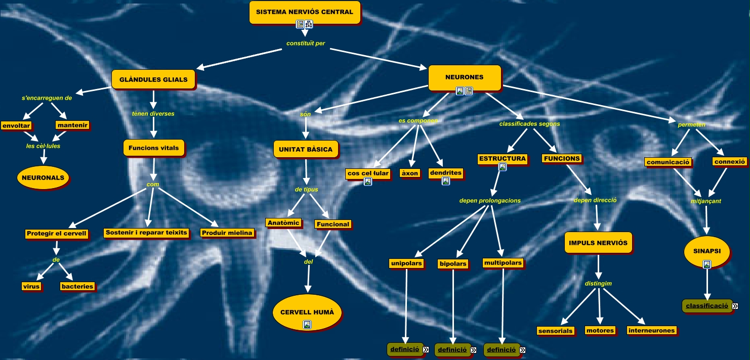 Aquest mapa conceptual conté informació relacionada amb: Composició SNC, comunicació mitjançant SINAPSI, SINAPSI tipus Elèctrica, multipolars característiques Són motores, mantenir les cèl·lules NEURONALS, FUNCIONS depen direcció IMPULS NERVIÓS, NEURONES es componen dendrites, connexió mitjançant SINAPSI, ESTRUCTURA depen prolongacions multipolars, NEURONES permeten comunicació, envoltar les cèl·lules NEURONALS, multipolars característiques moltes dendrites, SINAPSI tipus Química, ESTRUCTURA depen prolongacions unipolars, NEURONES es componen àxon, ESTRUCTURA depen prolongacions bipolars, Protegir el cervell de bacteries, unipolars característiques típics dels invertebrats, SISTEMA NERVIÓS CENTRAL constituït per GLÀNDULES GLIALS, NEURONES classificades segons ESTRUCTURA, UNITAT BÀSICA de tipus Funcional