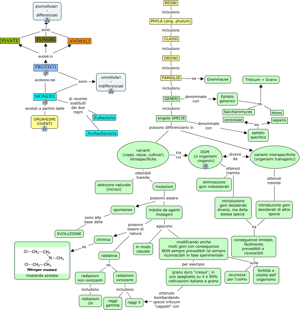 This Concept Map, created with IHMC CmapTools, has information related to: whittaker, radiazioni non ionizzanti includono radiazioni UV, REGNI includono PHYLA (sing. phylum), CLASSI includono ORDINI, GENERI denominate con Epiteto generico, varianti (ceppi, razze, cultivar) intraspecifiche ottenibili tramite selezione naturale (incroci), varianti (ceppi, razze, cultivar) intraspecifiche tra cui OGM (o organismi cisgenici), PROTISTI sono unicellulari - indifferenziati, radiazioni ionizzanti includono raggi gamma, MONERE di recente sostituiti dai due regni Archaebacteria, radiativa es. radiazioni non ionizzanti, PROTISTI evoluti in ANIMALI, OGM (o organismi cisgenici) ottenuti tramite eliminazione geni indesiderati, indotte da agenti mutageni possono essere di natura radiativa, singole SPECIE possono differenziarsi in varianti (ceppi, razze, cultivar) intraspecifiche, FAMIGLIE es Graminacee, PIANTE sono pluricellulari - differenziati, indotte da agenti mutageni agiscono in modo casuale, introduzione geni desiderati di altre specie ha conseguenze limitate, facilmente prevedibili e riconscibili, PROTISTI evoluti in PIANTE, modificando anche molti geni con conseguenze NON sempre prevedibili né sempre riconoscibili in fase sperimentale sulla sicurezza per l'uomo