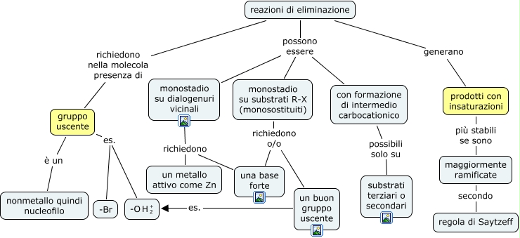 This Concept Map, created with IHMC CmapTools, has information related to: reazioni di eliminazione, monostadio su dialogenuri vicinali richiedono una base forte, maggiormente ramificate secondo regola di Saytzeff, reazioni di eliminazione richiedono nella molecola presenza di gruppo uscente, reazioni di eliminazione possono essere monostadio su dialogenuri vicinali, reazioni di eliminazione possono essere con formazione di intermedio carbocationico, monostadio su substrati R-X (monosostituiti) richiedono o/o una base forte, gruppo uscente è un nonmetallo quindi nucleofilo, un buon gruppo uscente es. <math xmlns="http://www.w3.org/1998/Math/MathML"> <mrow> <mtext> -O </mtext> <mmultiscripts> <mtext> H </mtext> <mtext> 2 </mtext> <mtext> + </mtext> </mmultiscripts> </mrow> </math>, prodotti con insaturazioni più stabili se sono maggiormente ramificate, gruppo uscente es. <math xmlns="http://www.w3.org/1998/Math/MathML"> <mrow> <mtext> -O </mtext> <mmultiscripts> <mtext> H </mtext> <mtext> 2 </mtext> <mtext> + </mtext> </mmultiscripts> </mrow> </math>, monostadio su dialogenuri vicinali richiedono un metallo attivo come Zn, reazioni di eliminazione possono essere monostadio su substrati R-X (monosostituiti), gruppo uscente es. -Br, monostadio su substrati R-X (monosostituiti) richiedono o/o un buon gruppo uscente, reazioni di eliminazione generano prodotti con insaturazioni, con formazione di intermedio carbocationico possibili solo su substrati terziari o secondari