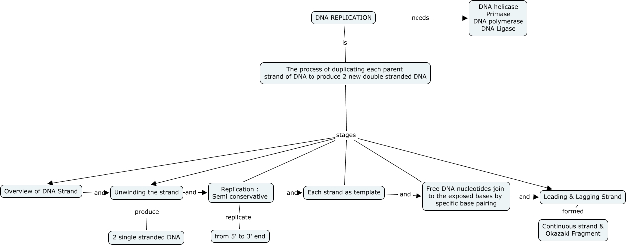 This Concept Map, created with IHMC CmapTools, has information related to: concept map DNA replication, DNA REPLICATION needs DNA helicase Primase DNA polymerase DNA Ligase, Unwinding the strand and Replication : Semi conservative, The process of duplicating each parent strand of DNA to produce 2 new double stranded DNA stages Leading & Lagging Strand, Replication : Semi conservative repilcate from 5' to 3' end, The process of duplicating each parent strand of DNA to produce 2 new double stranded DNA stages Unwinding the strand, Each strand as template and Free DNA nucleotides join to the exposed bases by specific base pairing, DNA REPLICATION is The process of duplicating each parent strand of DNA to produce 2 new double stranded DNA, The process of duplicating each parent strand of DNA to produce 2 new double stranded DNA stages Free DNA nucleotides join to the exposed bases by specific base pairing, The process of duplicating each parent strand of DNA to produce 2 new double stranded DNA stages Each strand as template, Overview of DNA Strand and Unwinding the strand, Replication : Semi conservative and Each strand as template, Free DNA nucleotides join to the exposed bases by specific base pairing and Leading & Lagging Strand, The process of duplicating each parent strand of DNA to produce 2 new double stranded DNA stages Overview of DNA Strand, The process of duplicating each parent strand of DNA to produce 2 new double stranded DNA stages Replication : Semi conservative, Unwinding the strand produce 2 single stranded DNA, Leading & Lagging Strand formed Continuous strand & Okazaki Fragment