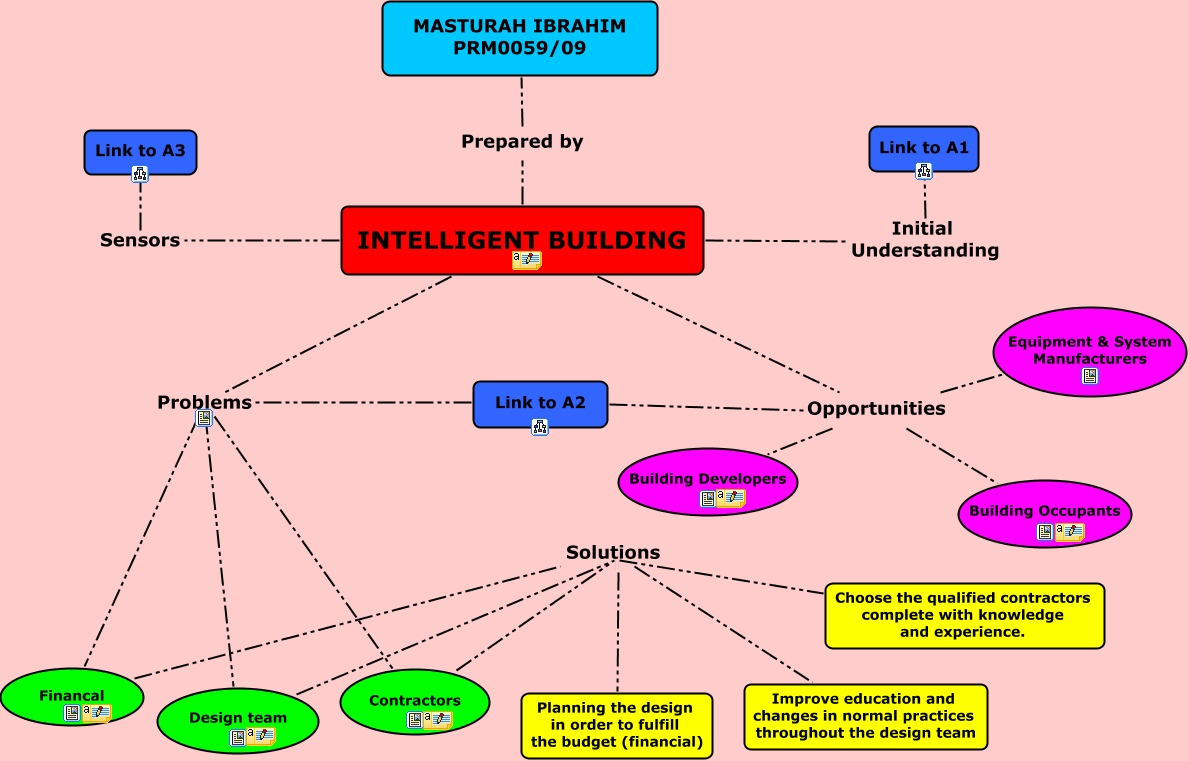 This Concept Map, created with IHMC CmapTools, has information related to: Problems in Intelligent Building, Link to A2 Problems Financal, INTELLIGENT BUILDING Opportunities Building Occupants, Link to A2 Opportunities Equipment & System Manufacturers, INTELLIGENT BUILDING Prepared by MASTURAH IBRAHIM PRM0059/09, Contractors Choose the qualified contractors complete with knowledge and experience., INTELLIGENT BUILDING Opportunities Building Developers, INTELLIGENT BUILDING Problems Contractors, INTELLIGENT BUILDING Sensors Link to A3, INTELLIGENT BUILDING Initial Understanding Link to A1, Financal Solutions Improve education and changes in normal practices throughout the design team, Link to A2 Opportunities Building Developers, Link to A2 Problems Contractors, INTELLIGENT BUILDING Problems Design team, INTELLIGENT BUILDING Problems Financal, Design team Planning the design in order to fulfill the budget (financial), Link to A2 Opportunities Building Occupants, Link to A2 Problems Design team, INTELLIGENT BUILDING Opportunities Equipment & System Manufacturers