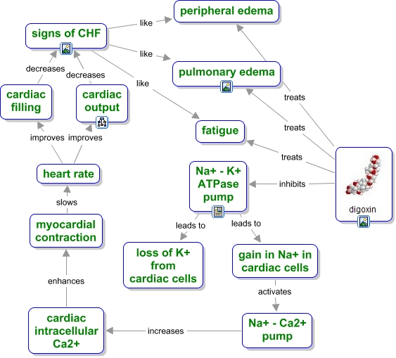 This Concept Map, created with IHMC CmapTools, has information related to: digoxincmap, signs of CHF like pulmonary edema, treats peripheral edema, heart rate improves cardiac output, Na+ - K+ ATPase pump leads to loss of K+ from cardiac cells, myocardial contraction slows heart rate, inhibits Na+ - K+ ATPase pump, gain in Na+ in cardiac cells activates Na+ - Ca2+ pump, cardiac intracellular Ca2+ enhances myocardial contraction, Na+ - K+ ATPase pump leads to gain in Na+ in cardiac cells, signs of CHF like fatigue, treats fatigue, cardiac filling decreases signs of CHF, heart rate improves cardiac filling, signs of CHF like peripheral edema, treats pulmonary edema, cardiac output decreases signs of CHF, Na+ - Ca2+ pump increases cardiac intracellular Ca2+