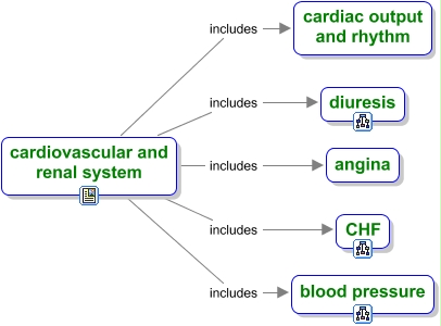 This Concept Map, created with IHMC CmapTools, has information related to: Cardiovascular, cardiovascular and renal system includes blood pressure, cardiovascular and renal system includes angina, cardiovascular and renal system includes cardiac output and rhythm, cardiovascular and renal system includes diuresis, cardiovascular and renal system includes CHF