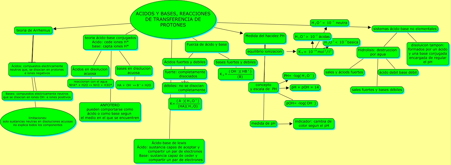 Este Cmap, tiene información relacionada con: bases y ácidos juanlu, concepto y escala de PH ???? <math xmlns="http://www.w3.org/1998/Math/MathML"> <mrow> <mtext> pOH= -log( </mtext> <mmultiscripts> <mtext> OH </mtext> <none/> <mtext> - </mtext> </mmultiscripts> <mtext> ) </mtext> </mrow> </math>, Ácidos fuertes y debiles ???? fuerte: completamente disociados, sistemas ácido-base no elementales ???? disoluicon tampon: formados por un ácido y una base conjugada encargada de regular el pH, ACIDOS Y BASES, REACCIONES DE TRANSFERENCIA DE PROTONES ???? teoria ácido-base conjugados Acido: cede iones H* base: capta iones H*, concepto y escala de PH ???? <math xmlns="http://www.w3.org/1998/Math/MathML"> <mrow> <mtext> PH= -log( </mtext> <mmultiscripts> <mtext> H </mtext> <mtext> 3 </mtext> <none/> </mmultiscripts> <mmultiscripts> <mtext> O </mtext> <none/> <mtext> + </mtext> </mmultiscripts> <mtext> ) </mtext> </mrow> </math>, teoria de Arrhenius ???? Bases: compuestos electricamente neutros que se disocian en iones OH- e iones positivos, teoria ácido-base conjugados Acido: cede iones H* base: capta iones H* ???? ANFOTERO pueden comportarse como ácido o como base segun el medio en el que se encuentren, Ácidos fuertes y debiles ???? débiles: no se disocian completamente, equilibrio ionizacion ???? <math xmlns="http://www.w3.org/1998/Math/MathML"> <mmultiscripts> <mtext> K </mtext> <mtext> w </mtext> <none/> </mmultiscripts> <mtext> = </mtext> <mmultiscripts> <mtext> 10 </mtext> <none/> <mtext> -14 </mtext> </mmultiscripts> <mmultiscripts> <mtext> mol </mtext> <none/> <mtext> 2 </mtext> </mmultiscripts> <mtext> / </mtext> <mmultiscripts> <mtext> l </mtext> <none/> <mtext> 2 </mtext> </mmultiscripts> </math>, Hidrolisis: destruccion por agua ???? sales y áciods fuertes, Fuerza de ácido y base ???? Ácidos fuertes y debiles, <math xmlns="http://www.w3.org/1998/Math/MathML"> <mmultiscripts> <mtext> K </mtext> <mtext> w </mtext> <none/> </mmultiscripts> <mtext> = </mtext> <mmultiscripts> <mtext> 10 </mtext> <none/> <mtext> -14 </mtext> </mmultiscripts> <mmultiscripts> <mtext> mol </mtext> <none/> <mtext> 2 </mtext> </mmultiscripts> <mtext> / </mtext> <mmultiscripts> <mtext> l </mtext> <none/> <mtext> 2 </mtext> </mmultiscripts> </math> ???? <math xmlns="http://www.w3.org/1998/Math/MathML"> <mrow> <mmultiscripts> <mtext> H </mtext> <mtext> 3 </mtext> <none/> </mmultiscripts> <mmultiscripts> <mtext> O </mtext> <none/> <mtext> + </mtext> </mmultiscripts> <mtext> ≺ </mtext> <mmultiscripts> <mtext> 10 </mtext> <none/> <mtext> -7 </mtext> </mmultiscripts> <mtext> basica </mtext> </mrow> </math>, ACIDOS Y BASES, REACCIONES DE TRANSFERENCIA DE PROTONES ???? Ácido-base de lewis Ácido: sustancia capas de aceptar y compartir un par de electrones Base: sustancia capaz de ceder y compartir un par de electrones, Medida del hacidez PH ???? medida de pH, ACIDOS Y BASES, REACCIONES DE TRANSFERENCIA DE PROTONES ???? Medida del hacidez PH, Medida del hacidez PH ???? equilibrio ionizacion, teoria ácido-base conjugados Acido: cede iones H* base: capta iones H* ???? Ácidos en disolucion acuosa, <math xmlns="http://www.w3.org/1998/Math/MathML"> <mmultiscripts> <mtext> K </mtext> <mtext> w </mtext> <none/> </mmultiscripts> <mtext> = </mtext> <mmultiscripts> <mtext> 10 </mtext> <none/> <mtext> -14 </mtext> </mmultiscripts> <mmultiscripts> <mtext> mol </mtext> <none/> <mtext> 2 </mtext> </mmultiscripts> <mtext> / </mtext> <mmultiscripts> <mtext> l </mtext> <none/> <mtext> 2 </mtext> </mmultiscripts> </math> ???? <math xmlns="http://www.w3.org/1998/Math/MathML"> <mrow> <mmultiscripts> <mtext> H </mtext> <mtext> 3 </mtext> <none/> </mmultiscripts> <mmultiscripts> <mtext> O </mtext> <none/> <mtext> + </mtext> </mmultiscripts> <mtext> = </mtext> <mmultiscripts> <mtext> 10 </mtext> <none/> <mtext> -7 </mtext> </mmultiscripts> <mtext> neutra </mtext> </mrow> </math>, ACIDOS Y BASES, REACCIONES DE TRANSFERENCIA DE PROTONES ???? Fuerza de ácido y base, ACIDOS Y BASES, REACCIONES DE TRANSFERENCIA DE PROTONES ???? teoria de Arrhenius