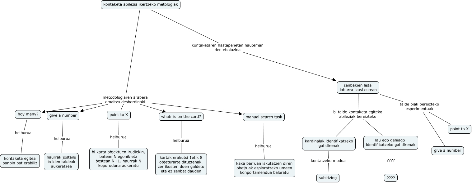 Este Cmap, tiene información relacionada con: 6.a, hoy many? helburua kontaketa egitea panpin bat erabiliz, zenbakien lista laburra ikasi ostean bi talde kontaketa egiteko abileziak bereizteko kardinalak identifikatzeko gai direnak, kontaketa abilezia ikertzeko metologiak metodologiaren arabera emaitza desberdinaki give a number, point to X helburua bi karta objektuen irudiekin, batean N egonik eta bestean N+1. haurrak N kopuruduna aukeratu, lau edo gehiago identifikatzeko gai direnak ???? ????, zenbakien lista laburra ikasi ostean talde biak bereizteko esperimentuak point to X, kontaketa abilezia ikertzeko metologiak metodologiaren arabera emaitza desberdinaki whatr is on the card?, kontaketa abilezia ikertzeko metologiak kontaketaren hastapenetan hauteman den eboluzioa zenbakien lista laburra ikasi ostean, kardinalak identifikatzeko gai direnak kontatzeko modua subitizing, kontaketa abilezia ikertzeko metologiak metodologiaren arabera emaitza desberdinaki hoy many?, kontaketa abilezia ikertzeko metologiak metodologiaren arabera emaitza desberdinaki point to X, give a number helburua haurrak jostailu txikien taldeak aukeratzea, zenbakien lista laburra ikasi ostean bi talde kontaketa egiteko abileziak bereizteko lau edo gehiago identifikatzeko gai direnak, manual search task helburua kaxa barruan iskutatzen diren obejtuak esploratzeko umeen konportamendua baloratu, zenbakien lista laburra ikasi ostean talde biak bereizteko esperimentuak give a number, whatr is on the card? helburua kartak erakutsi 1etik 8 objeturarte dituztenak. zer ikusten duen galdetu eta ez zenbat dauden, kontaketa abilezia ikertzeko metologiak metodologiaren arabera emaitza desberdinaki manual search task