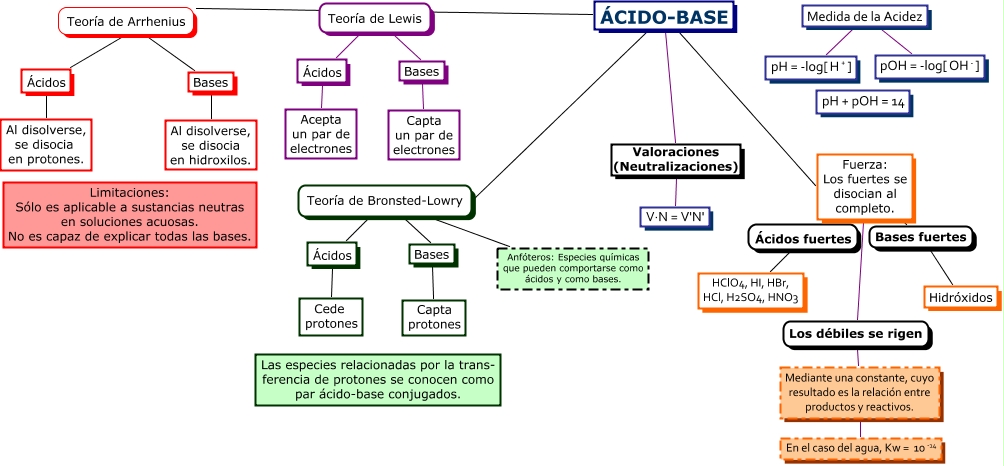 Aquest mapa conceptual conté informació relacionada amb: Ácidos-Bases Dani Hu, Medida de la Acidez <math xmlns="http://www.w3.org/1998/Math/MathML"> <mrow> <mtext> pH = -log[ </mtext> <mmultiscripts> <mtext> H </mtext> <none/> <mtext> + </mtext> </mmultiscripts> <mtext> ] </mtext> </mrow> </math>, Teoría de Lewis Bases, ÁCIDO-BASE Teoría de Bronsted-Lowry, ÁCIDO-BASE Valoraciones (Neutralizaciones) V·N = V'N', Teoría de Lewis Ácidos, Bases <math xmlns="http://www.w3.org/1998/Math/MathML"> <mtext> Capta