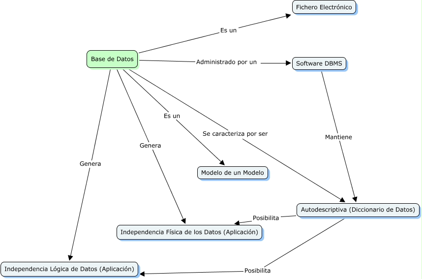 Este Cmap, tiene información relacionada con: Base de Datos, Base de Datos Es un Fichero Electrónico, Base de Datos Genera Independencia Física de los Datos (Aplicación), Autodescriptiva (Diccionario de Datos) Posibilita Independencia Física de los Datos (Aplicación), Base de Datos Se caracteriza por ser Autodescriptiva (Diccionario de Datos), Base de Datos Es un Modelo de un Modelo, Software DBMS Mantiene Autodescriptiva (Diccionario de Datos), Base de Datos Genera Independencia Lógica de Datos (Aplicación), Autodescriptiva (Diccionario de Datos) Posibilita Independencia Lógica de Datos (Aplicación), Base de Datos Administrado por un Software DBMS