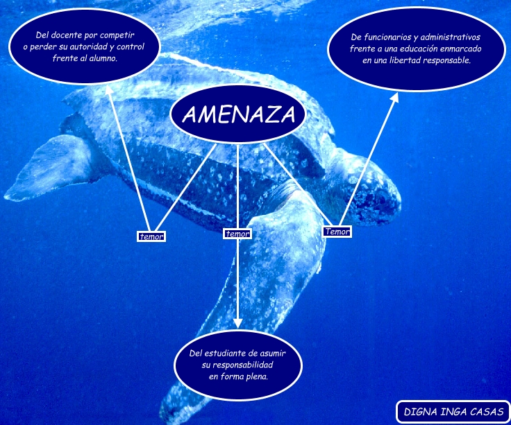 Este Cmap, tiene información relacionada con: ENFOQUE HUMANISTA - AMENAZA, AMENAZA temor Del estudiante de asumir su responsabilidad en forma plena., AMENAZA temor Del docente por competir o perder su autoridad y control frente al alumno., AMENAZA Temor De funcionarios y administrativos frente a una educación enmarcado en una libertad responsable.