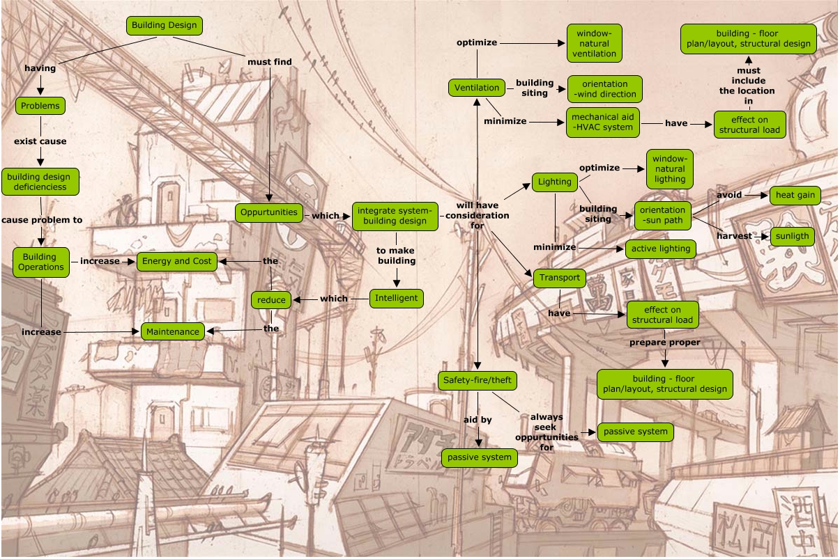 This Concept Map, created with IHMC CmapTools, has information related to: Building Design, building design deficienciess cause problem to Building Operations, Building Operations increase Maintenance, Transport have effect on structural load, integrate system- building design to make building Intelligent, integrate system- building design will have consideration for Transport, mechanical aid -HVAC system have effect on structural load, Oppurtunities which integrate system- building design, effect on structural load prepare proper building - floor plan/layout, structural design, reduce the Energy and Cost, Ventilation minimize mechanical aid -HVAC system, Lighting building siting orientation -sun path, orientation -sun path harvest sunligth, Ventilation optimize window- natural ventilation, Lighting optimize window- natural ligthing, Lighting minimize active lighting, integrate system- building design will have consideration for Ventilation, effect on structural load must include the location in building - floor plan/layout, structural design, Ventilation building siting orientation -wind direction, Intelligent which reduce, Building Operations increase Energy and Cost