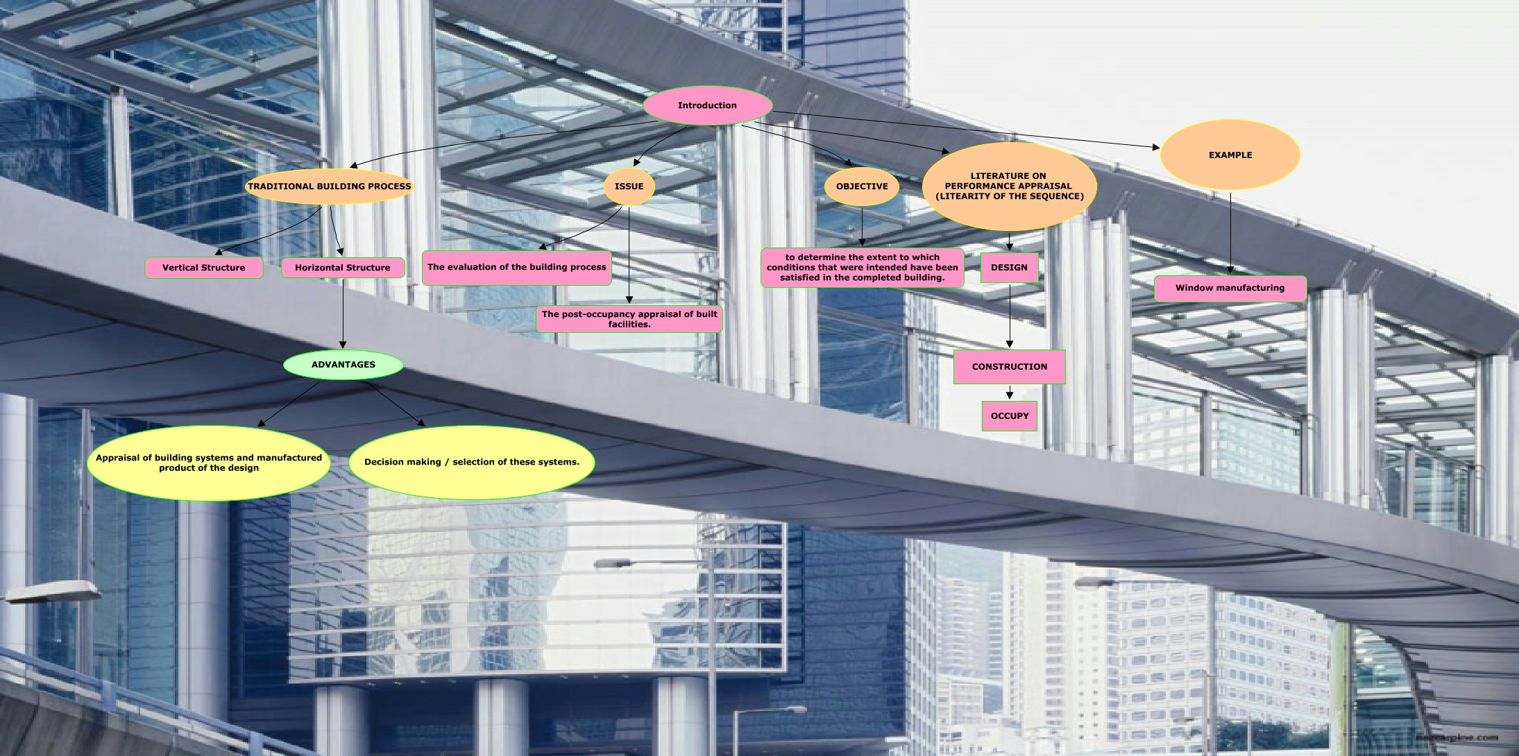 This Concept Map, created with IHMC CmapTools, has information related to: introduction, Introduction OBJECTIVE to determine the extent to which conditions that were intended have been satisfied in the completed building., Introduction EXAMPLE Window manufacturing, Horizontal Structure ADVANTAGES Decision making / selection of these systems., Introduction ISSUE The post-occupancy appraisal of built facilities., Introduction LITERATURE ON PERFORMANCE APPRAISAL (LITEARITY OF THE SEQUENCE) DESIGN, Introduction TRADITIONAL BUILDING PROCESS Vertical Structure, DESIGN CONSTRUCTION OCCUPY, Introduction ISSUE The evaluation of the building process, Introduction TRADITIONAL BUILDING PROCESS Horizontal Structure, Horizontal Structure ADVANTAGES Appraisal of building systems and manufactured product of the design