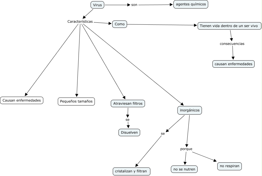 Este Cmap, tiene información relacionada con: Virus, Como ???? Tienen vida dentro de un ser vivo, inorgánicos porque no respiran, Tienen vida dentro de un ser vivo consecuencias causan enfermedades, inorgánicos se cristalizan y filtran, Virus son agentes químicos, inorgánicos porque no se nutren, Virus Características Causan enfermedades, Virus Características Pequeños tamaños, Atraviesan filtros se Disuelven, Virus Características Como, Virus Características inorgánicos, Virus Características Atraviesan filtros