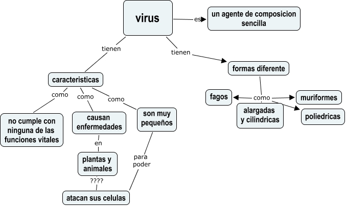 Este Cmap, tiene información relacionada con: dany y lu d, son muy pequeños para poder atacan sus celulas, virus tienen caracteristicas, causan enfermedades en plantas y animales, formas diferente como muriformes, formas diferente como fagos, caracteristicas como son muy pequeños, caracteristicas como causan enfermedades, formas diferente como alargadas y cilindricas, plantas y animales ???? atacan sus celulas, formas diferente como poliedricas, virus tienen formas diferente, caracteristicas como no cumple con ninguna de las funciones vitales, virus es un agente de composicion sencilla