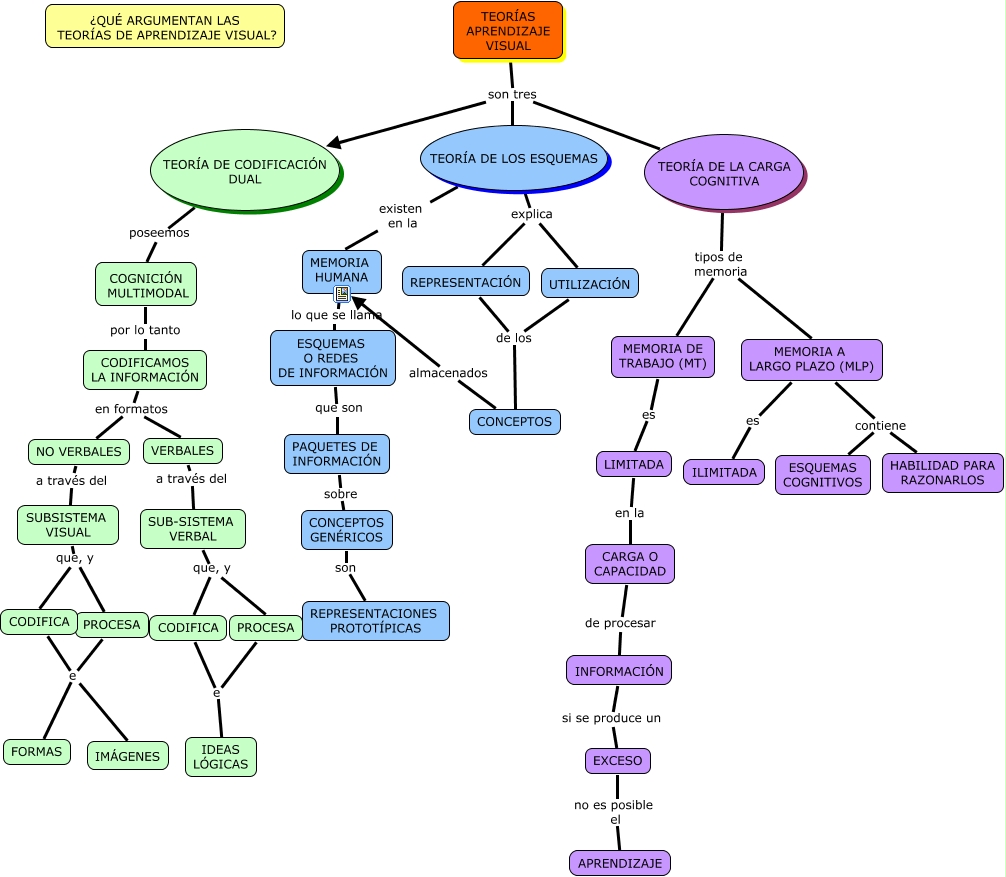 Este Cmap, tiene información relacionada con: TEORÍAS APRENDIZAJE VISUAL, PROCESA e FORMAS, PROCESA e IDEAS LÓGICAS, MEMORIA HUMANA lo que se llama ESQUEMAS O REDES DE INFORMACIÓN, MEMORIA A LARGO PLAZO (MLP) contiene HABILIDAD PARA RAZONARLOS, SUBSISTEMA VISUAL que, y CODIFICA, PROCESA e IMÁGENES, TEORÍA DE LA CARGA COGNITIVA tipos de memoria MEMORIA A LARGO PLAZO (MLP), CODIFICA e IDEAS LÓGICAS, TEORÍA DE LOS ESQUEMAS existen en la MEMORIA HUMANA, CODIFICAMOS LA INFORMACIÓN en formatos NO VERBALES, REPRESENTACIÓN de los CONCEPTOS, CODIFICA e FORMAS, EXCESO no es posible el APRENDIZAJE, ESQUEMAS O REDES DE INFORMACIÓN que son PAQUETES DE INFORMACIÓN, TEORÍAS APRENDIZAJE VISUAL son tres TEORÍA DE CODIFICACIÓN DUAL, MEMORIA A LARGO PLAZO (MLP) es ILIMITADA, MEMORIA DE TRABAJO (MT) es LIMITADA, TEORÍA DE LOS ESQUEMAS explica UTILIZACIÓN, CARGA O CAPACIDAD de procesar INFORMACIÓN, UTILIZACIÓN de los CONCEPTOS