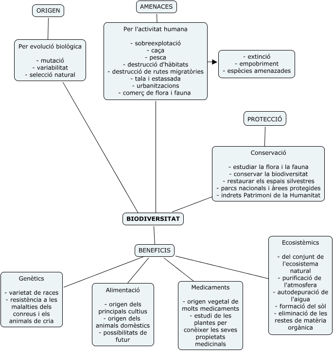 Este Cmap, tiene información relacionada con: biodiversitat, BENEFICIS ???? Alimentació - origen dels principals cultius - origen dels animals domèstics - possibilitats de futur, BIODIVERSITAT ???? BENEFICIS, ORIGEN ???? Per evolució biològica - mutació - variabilitat - selecció natural, Per evolució biològica - mutació - variabilitat - selecció natural ???? BIODIVERSITAT, PROTECCIÓ ???? Conservació - estudiar la flora i la fauna - conservar la biodiversitat - restaurar els espais silvestres - parcs nacionals i àrees protegides - indrets Patrimoni de la Humanitat, BENEFICIS ???? Medicaments - origen vegetal de molts medicaments - estudi de les plantes per conèixer les seves propietats medicinals, Conservació - estudiar la flora i la fauna - conservar la biodiversitat - restaurar els espais silvestres - parcs nacionals i àrees protegides - indrets Patrimoni de la Humanitat ???? BIODIVERSITAT, AMENACES ???? Per l'activitat humana - sobreexplotació - caça - pesca - destrucció d'hàbitats - destrucció de rutes migratòries - tala i estassada - urbanitzacions - comerç de flora i fauna, BENEFICIS ???? Ecosistèmics - del conjunt de l'ecosistema natural - purificació de l'atmosfera - autodepuració de l'aigua - formació del sòl - eliminació de les restes de matèria orgànica, BENEFICIS ???? Genètics - varietat de races - resistència a les malalties dels conreus i els animals de cria, Per l'activitat humana - sobreexplotació - caça - pesca - destrucció d'hàbitats - destrucció de rutes migratòries - tala i estassada - urbanitzacions - comerç de flora i fauna ???? - extinció - empobriment - espècies amenazades, Per l'activitat humana - sobreexplotació - caça - pesca - destrucció d'hàbitats - destrucció de rutes migratòries - tala i estassada - urbanitzacions - comerç de flora i fauna ???? BIODIVERSITAT