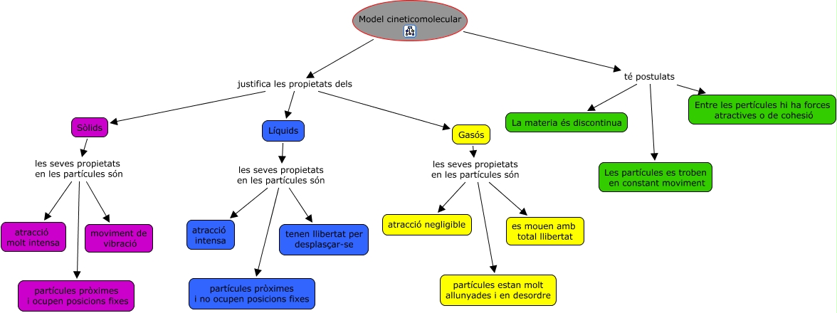 Este Cmap, tiene información relacionada con: model cineticomolecular, Model cineticomolecular té postulats Entre les pertícules hi ha forces atractives o de cohesió, Gasós les seves propietats en les partícules són es mouen amb total llibertat, Sòlids les seves propietats en les partícules són moviment de vibració, Model cineticomolecular justifica les propietats dels Gasós, Model cineticomolecular té postulats Les partícules es troben en constant moviment, Model cineticomolecular té postulats La materia és discontinua, Sòlids les seves propietats en les partícules són partícules pròximes i ocupen posicions fixes, Líquids les seves propietats en les partícules són partícules pròximes i no ocupen posicions fixes, Líquids les seves propietats en les partícules són atracció intensa, Sòlids les seves propietats en les partícules són atracció molt intensa, Gasós les seves propietats en les partícules són partícules estan molt allunyades i en desordre, Gasós les seves propietats en les partícules són atracció negligible, Model cineticomolecular justifica les propietats dels Líquids, Model cineticomolecular justifica les propietats dels Sòlids, Líquids les seves propietats en les partícules són tenen llibertat per desplasçar-se