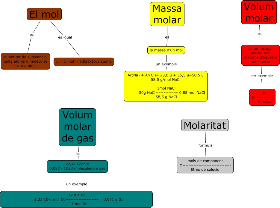 Este Cmap, tiene información relacionada con: Quantitat de substancia, El mol es quantitat de substancia tants atoms o molecules com atoms, Volum molar de gas es 22,4L i conte 6,022 · 1023 molecules de gas, la massa d'un mol un exemple Ar(Na) + Ar(Cl)= 23,0 u + 35,5 u=58,5 u 58,5 g/mol NaCl 1mol NaCl 50g NaCl------------= 0,85 mol NaCl 58,5 g NaCl, El mol es igual L = 1 mol ≈ 6,022·1023 atoms, Volum molar es volum ocupat per un mol d'atoms d'aquesta substancia, 22,4L i conte 6,022 · 1023 molecules de gas un exemple 32,0 g 02 2,23·10-3 mol O2-------------------- = 0,071 g 02 1 mol 02, Massa molar es la massa d'un mol, Molaritat formula mols de component M=---------------------------- litres de solucio, volum ocupat per un mol d'atoms d'aquesta substancia per exemple M d=---------- V molar