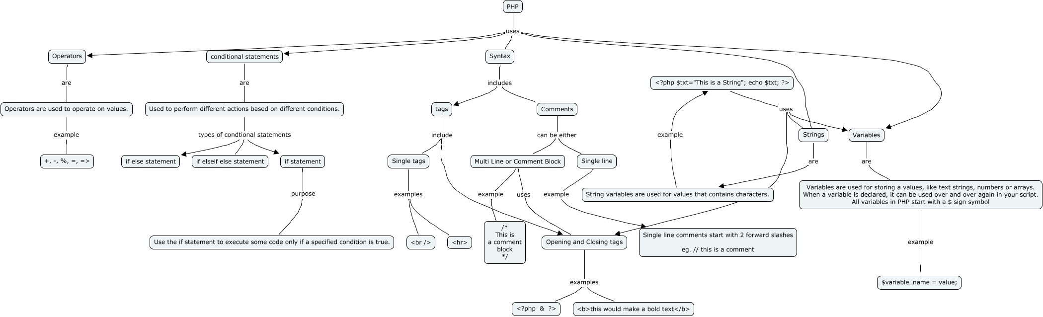 This Concept Map, created with IHMC CmapTools, has information related to: PHPBD, Single tags examples <br />, Strings are String variables are used for values that contains characters., PHP uses Operators, conditional statements are Used to perform different actions based on different conditions., Comments can be either Single line, <?php $txt="This is a String"; echo $txt; ?> uses Opening and Closing tags, Variables are used for storing a values, like text strings, numbers or arrays. When a variable is declared, it can be used over and over again in your script. All variables in PHP start with a $ sign symbol example $variable_name = value;, Opening and Closing tags examples <?php & ?>, String variables are used for values that contains characters. example <?php $txt="This is a String"; echo $txt; ?>, Syntax includes Comments, Opening and Closing tags examples <b>this would make a bold text</b>, Syntax includes tags, tags include Opening and Closing tags, PHP uses conditional statements, Multi Line or Comment Block uses Opening and Closing tags, Operators are Operators are used to operate on values., Multi Line or Comment Block example /* This is a comment block */, Comments can be either Multi Line or Comment Block, Variables are Variables are used for storing a values, like text strings, numbers or arrays. When a variable is declared, it can be used over and over again in your script. All variables in PHP start with a $ sign symbol, PHP uses Variables