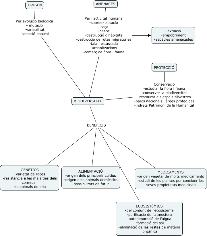 Este Cmap, tiene información relacionada con: Esquemaa, BIODIVERSITAT Conservació -estudiar la flora i fauna -conservar la biodiversitat -restaurar els espais silvestres -parcs nacionals i àrees protegides -indrets Patrimoni de la Humanitat PROTECCIÓ, BIODIVERSITAT BENEFICIS ALIMENTACIÓ -origen dels principals cultius -origen dels animals domèstics -possibilitats de futur, PROTECCIÓ Conservació -estudiar la flora i fauna -conservar la biodiversitat -restaurar els espais silvestres -parcs nacionals i àrees protegides -indrets Patrimoni de la Humanitat PROTECCIÓ, BIODIVERSITAT Per l'activitat humana -sobreexplotació -caça -pesca -destrucció d'hàbitats -destrucció de rutes migratòries -tala i estassada -urbanitzacions -comerç de flora i fauna -extinció -empobriment -espècies amenaçades, AMENACES Per l'activitat humana -sobreexplotació -caça -pesca -destrucció d'hàbitats -destrucció de rutes migratòries -tala i estassada -urbanitzacions -comerç de flora i fauna -extinció -empobriment -espècies amenaçades, BIODIVERSITAT BENEFICIS ECOSISTÈMICS -del conjunt de l'ecosistema -purificació de l'atmosfera -autodepuració de l'aigua -formació del sól -eliminació de les restes de matèria orgànica, BIODIVERSITAT BENEFICIS MEDICAMENTS -origen vegetal de molts medicaments -estudi de les plantes per conèixer les seves propietatas medicinals, ORIGEN Per evolució biològica - mutació -variabilitat -selecció natural BIODIVERSITAT, BIODIVERSITAT BENEFICIS GENÈTICS -varietat de races -resistència a les malalties dels conreus i els animals de cria