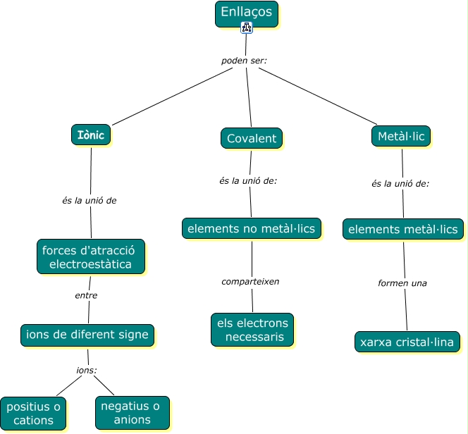 Este Cmap, tiene información relacionada con: enllaços quimics, Metàl·lic és la unió de: elements metàl·lics, ions de diferent signe ions: positius o cations, elements metàl·lics formen una xarxa cristal·lina, Enllaços poden ser: Metàl·lic, Enllaços poden ser: Covalent, ions de diferent signe ions: negatius o anions, forces d'atracció electroestàtica entre ions de diferent signe, elements no metàl·lics comparteixen els electrons necessaris, Covalent és la unió de: elements no metàl·lics, Enllaços poden ser: Iònic, Iònic és la unió de forces d'atracció electroestàtica