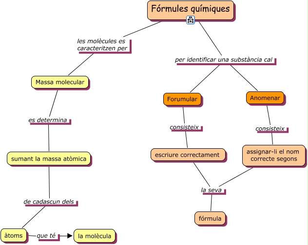 Este Cmap, tiene información relacionada con: formules químiques, Anomenar consisteix assignar-li el nom correcte segons, escriure correctament la seva fórmula, àtoms que té la molècula, sumant la massa atòmica de cadascun dels àtoms, Fórmules químiques per identificar una substància cal Anomenar, Forumular consisteix escriure correctament, Massa molecular es determina sumant la massa atòmica, assignar-li el nom correcte segons la seva fórmula, Fórmules químiques les molècules es caracteritzen per Massa molecular, Fórmules químiques per identificar una substància cal Forumular