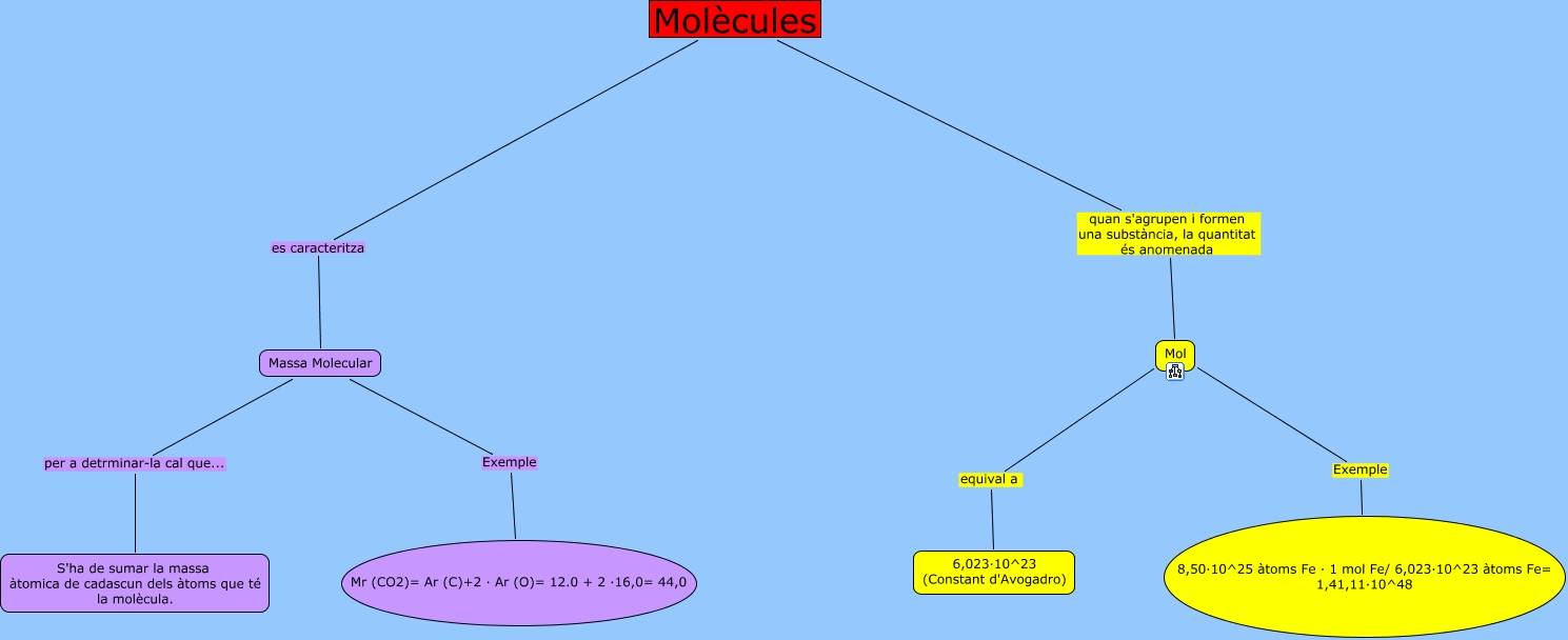 Este Cmap, tiene información relacionada con: Molècules, Molècules es caracteritza Massa Molecular, Mol equival a 6,023·10^23 (Constant d'Avogadro), Molècules quan s'agrupen i formen una substància, la quantitat és anomenada Mol, Massa Molecular Exemple Mr (CO2)= Ar (C)+2 · Ar (O)= 12.0 + 2 ·16,0= 44,0, Mol Exemple 8,50·10^25 àtoms Fe · 1 mol Fe/ 6,023·10^23 àtoms Fe= 1,41,11·10^48, Massa Molecular per a detrminar-la cal que... S'ha de sumar la massa àtomica de cadascun dels àtoms que té la molècula.