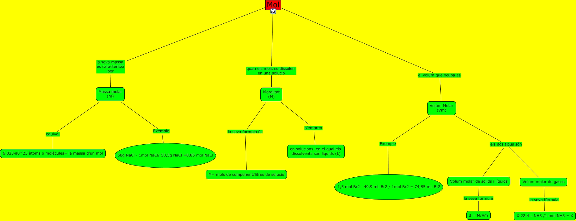 Este Cmap, tiene información relacionada con: Mol, Moralitat (M) la seva fòrmula és M= mols de component/litres de solució, Mol el volum que ocupa es Volum Molar (Vm), Volum Molar (Vm) Exemple 1,5 mol Br2 · 49,9 mL Br2 / 1mol Br2 = 74,85 mL Br2, Moralitat (M) s'empren en solucions en el qual els dissolvents són líquids (L), Volum Molar (Vm) els dos tipus són Volum molar de sòlids i líquids, Massa molar (m) Exemple 50g NaCl · 1mol NaCl/ 58,5g NaCl =0,85 mol NaCl, Volum Molar (Vm) els dos tipus són Volum molar de gasos, Mol quan els mols es dissolen en una solució Moralitat (M), Massa molar (m) equival 6,023·a0^23 àtoms o molècules= la massa d'un mol, Volum molar de gasos la seva fòrmula X·22,4 L NH3 /1 mol NH3 = X, Mol la seva massa es caracteritza per Massa molar (m), Volum molar de sòlids i líquids la seva fòrmula d = M/Vm