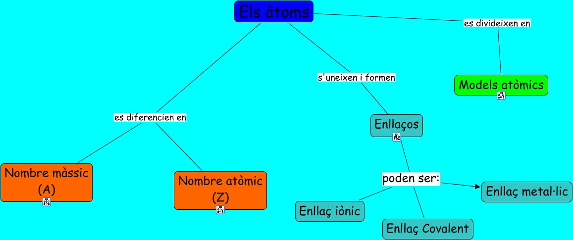 Este Cmap, tiene información relacionada con: àtom, Enllaços poden ser: Enllaç iònic, Els àtoms s'uneixen i formen Enllaços, Els àtoms es divideixen en Models atòmics, Els àtoms es diferencien en Nombre atòmic (Z), Enllaços poden ser: Enllaç Covalent, Enllaços poden ser: Enllaç metal·lic, Els àtoms es diferencien en Nombre màssic (A)