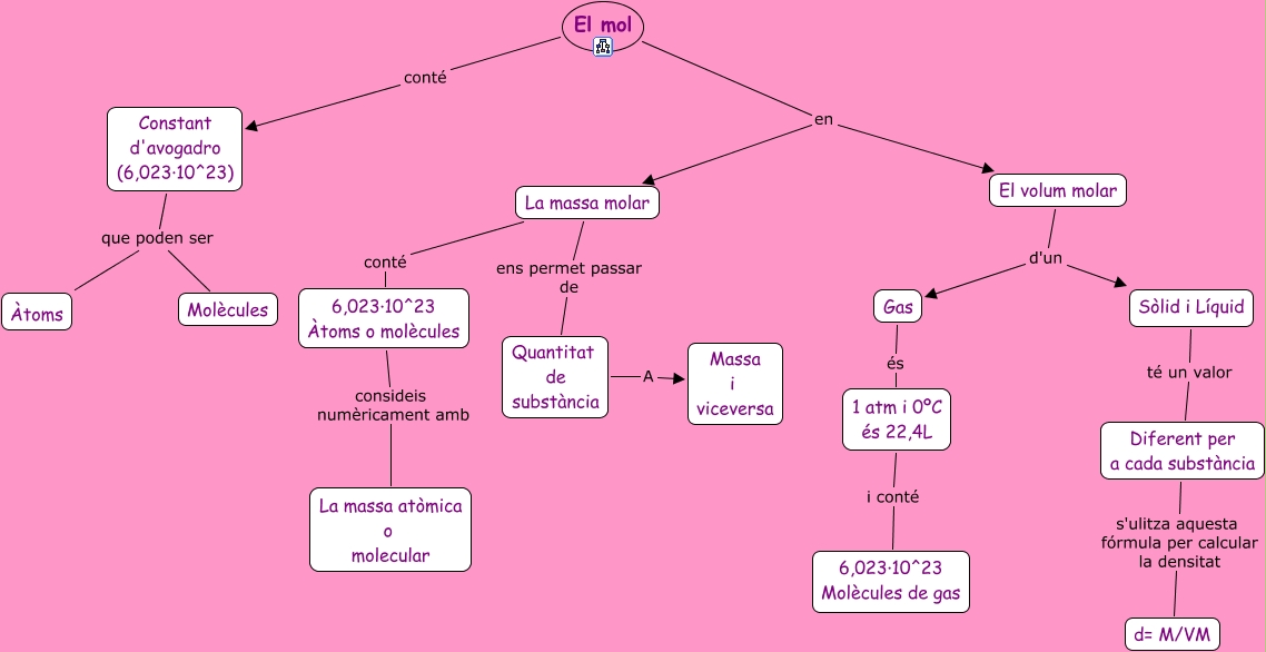 Este Cmap, tiene información relacionada con: El mol, La massa molar ens permet passar de Quantitat de substància, Sòlid i Líquid té un valor Diferent per a cada substància, 6,023·10^23 Àtoms o molècules consideis numèricament amb La massa atòmica o molecular, Gas és 1 atm i 0ºC és 22,4L, Constant d'avogadro (6,023·10^23) que poden ser Molècules, El volum molar d'un Sòlid i Líquid, 1 atm i 0ºC és 22,4L i conté 6,023·10^23 Molècules de gas, Quantitat de substància A Massa i viceversa, Diferent per a cada substància s'ulitza aquesta fórmula per calcular la densitat d= M/VM, Constant d'avogadro (6,023·10^23) que poden ser Àtoms, El volum molar d'un Gas, El mol conté Constant d'avogadro (6,023·10^23), La massa molar conté 6,023·10^23 Àtoms o molècules, El mol en El volum molar, El mol en La massa molar