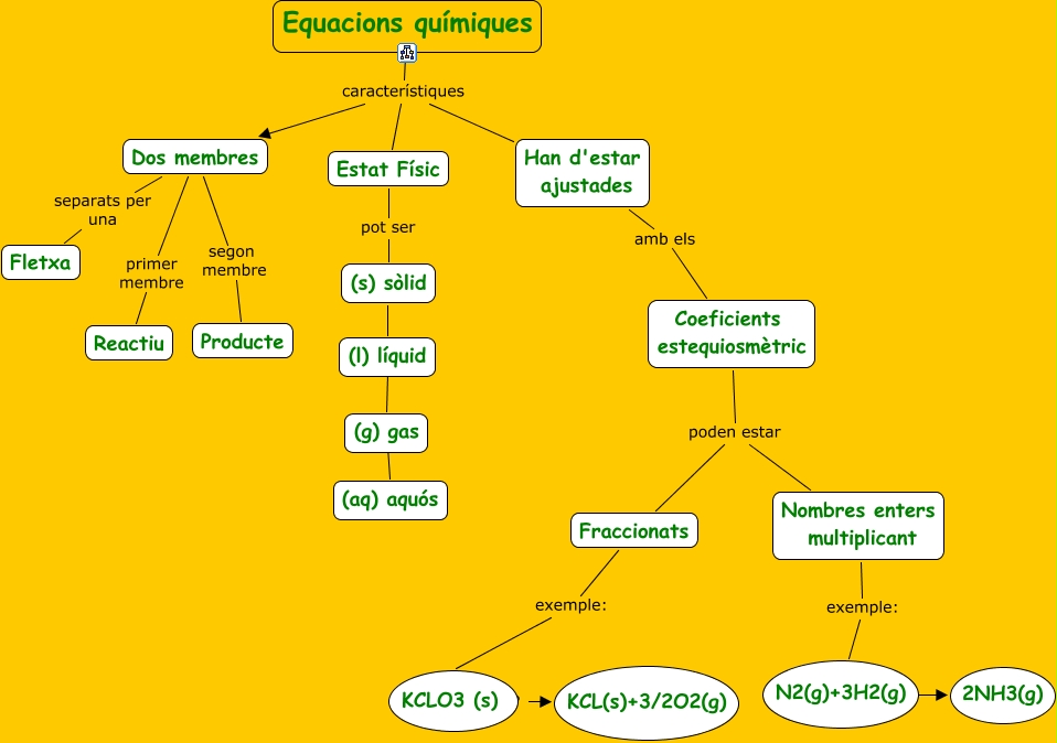 Este Cmap, tiene información relacionada con: Equacions químiques, N2(g)+3H2(g) ???? 2NH3(g), Coeficients estequiosmètric poden estar Fraccionats, (g) gas ???? (aq) aquós, (l) líquid ???? (g) gas, (s) sòlid ???? (l) líquid, Coeficients estequiosmètric poden estar Nombres enters multiplicant, Estat Físic pot ser (s) sòlid, Han d'estar ajustades amb els Coeficients estequiosmètric, Dos membres primer membre Reactiu, Dos membres separats per una Fletxa, Equacions químiques característiques Han d'estar ajustades, KCLO3 (s) ???? KCL(s)+3/2O2(g), Dos membres segon membre Producte, Equacions químiques característiques Estat Físic, Equacions químiques característiques Dos membres, Fraccionats exemple: KCLO3 (s), Nombres enters multiplicant exemple: N2(g)+3H2(g)