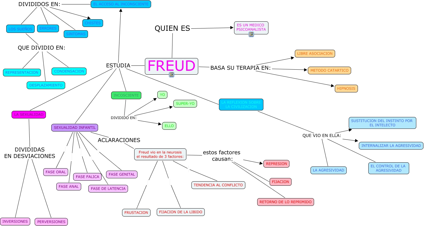 Este Cmap, tiene información relacionada con: freud por karol, LA SEXUALIDAD DIVIDIDAS EN DESVIACIONES PERVERSIONES, FREUD BASA SU TERAPIA EN: LIBRE ASOCIACION, FREUD BASA SU TERAPIA EN: HIPNOSIS, Freud vio en la neurosis el resultado de 3 factores: estos factores causan: RETORNO DE LO REPRIMIDO, EL ACCESO AL INCONSCIENTE DIVIDIDOS EN: LOS SUEÑOS, FREUD BASA SU TERAPIA EN: METODO CATARTICO, EL ACCESO AL INCONSCIENTE DIVIDIDOS EN: ERRORES, LA REFLEXION SOBRE LA CIVILIZACION QUE VIO EN ELLA: SUSTITUCION DEL INSTINTO POR EL INTELECTO, LA REFLEXION SOBRE LA CIVILIZACION QUE VIO EN ELLA: EL CONTROL DE LA AGRESIVIDAD, INCOSCIENTE DIVIDIDO EN: ELLO, SEXUALIDAD INFANTIL FASE DE LATENCIA, SEXUALIDAD INFANTIL FASE FALICA, FREUD ESTUDIA EL ACCESO AL INCONSCIENTE, LOS SUEÑOS QUE DIVIDIO EN: CONDENSACION, SEXUALIDAD INFANTIL FASE GENITAL, LA REFLEXION SOBRE LA CIVILIZACION QUE VIO EN ELLA: LA AGRESIVIDAD, Freud vio en la neurosis el resultado de 3 factores: TENDENCIA AL CONFLICTO, EL ACCESO AL INCONSCIENTE DIVIDIDOS EN: CHISTES, LA REFLEXION SOBRE LA CIVILIZACION QUE VIO EN ELLA: INTERNALIZAR LA AGRESIVIDAD, INCOSCIENTE DIVIDIDO EN: YO