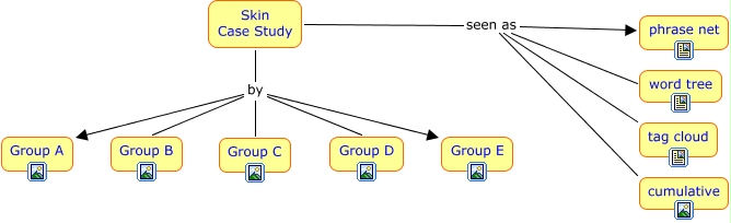This Concept Map, created with IHMC CmapTools, has information related to: Week 11 discussion - skin, Skin Case Study by Group A, Skin Case Study seen as tag cloud, Skin Case Study seen as cumulative, Skin Case Study by Group C, Skin Case Study by Group B, Skin Case Study seen as word tree, Skin Case Study by Group D, Skin Case Study seen as phrase net, Skin Case Study by Group E