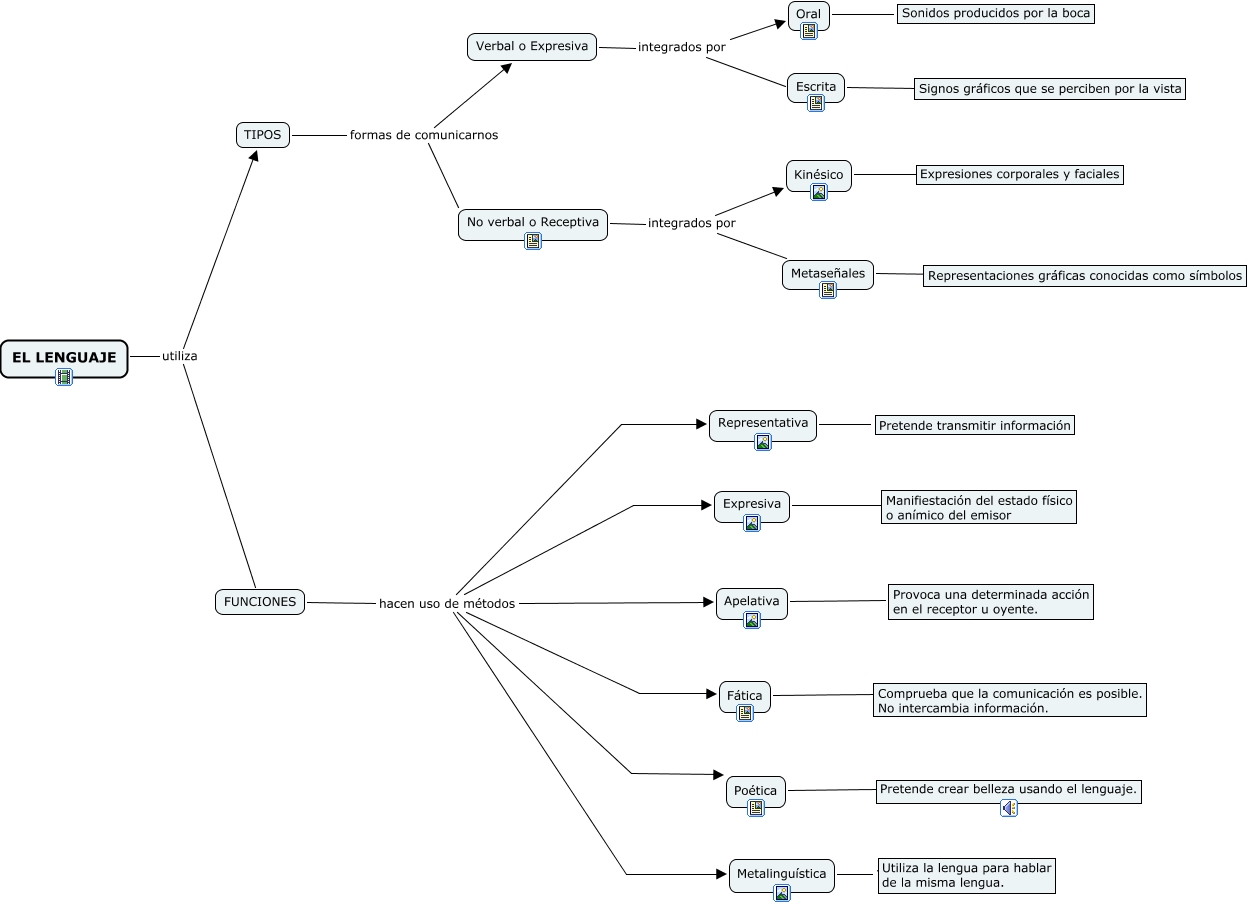 Este Cmap, tiene información relacionada con: El Lenguaje, Verbal o Expresiva integrados por Oral, FUNCIONES hacen uso de métodos Expresiva, No verbal o Receptiva integrados por Kinésico, FUNCIONES hacen uso de métodos Representativa, EL LENGUAJE utiliza FUNCIONES, Fática ???? Comprueba que la comunicación es posible. No intercambia información., Oral ???? Sonidos producidos por la boca, Verbal o Expresiva integrados por Escrita, Metalinguística ???? Utiliza la lengua para hablar de la misma lengua., Escrita ???? Signos gráficos que se perciben por la vista, Apelativa ???? Provoca una determinada acción en el receptor u oyente., TIPOS formas de comunicarnos Verbal o Expresiva, FUNCIONES hacen uso de métodos Poética, Representativa ???? Pretende transmitir información, Kinésico ???? Expresiones corporales y faciales, FUNCIONES hacen uso de métodos Metalinguística, TIPOS formas de comunicarnos No verbal o Receptiva, FUNCIONES hacen uso de métodos Apelativa, EL LENGUAJE utiliza TIPOS, FUNCIONES hacen uso de métodos Fática