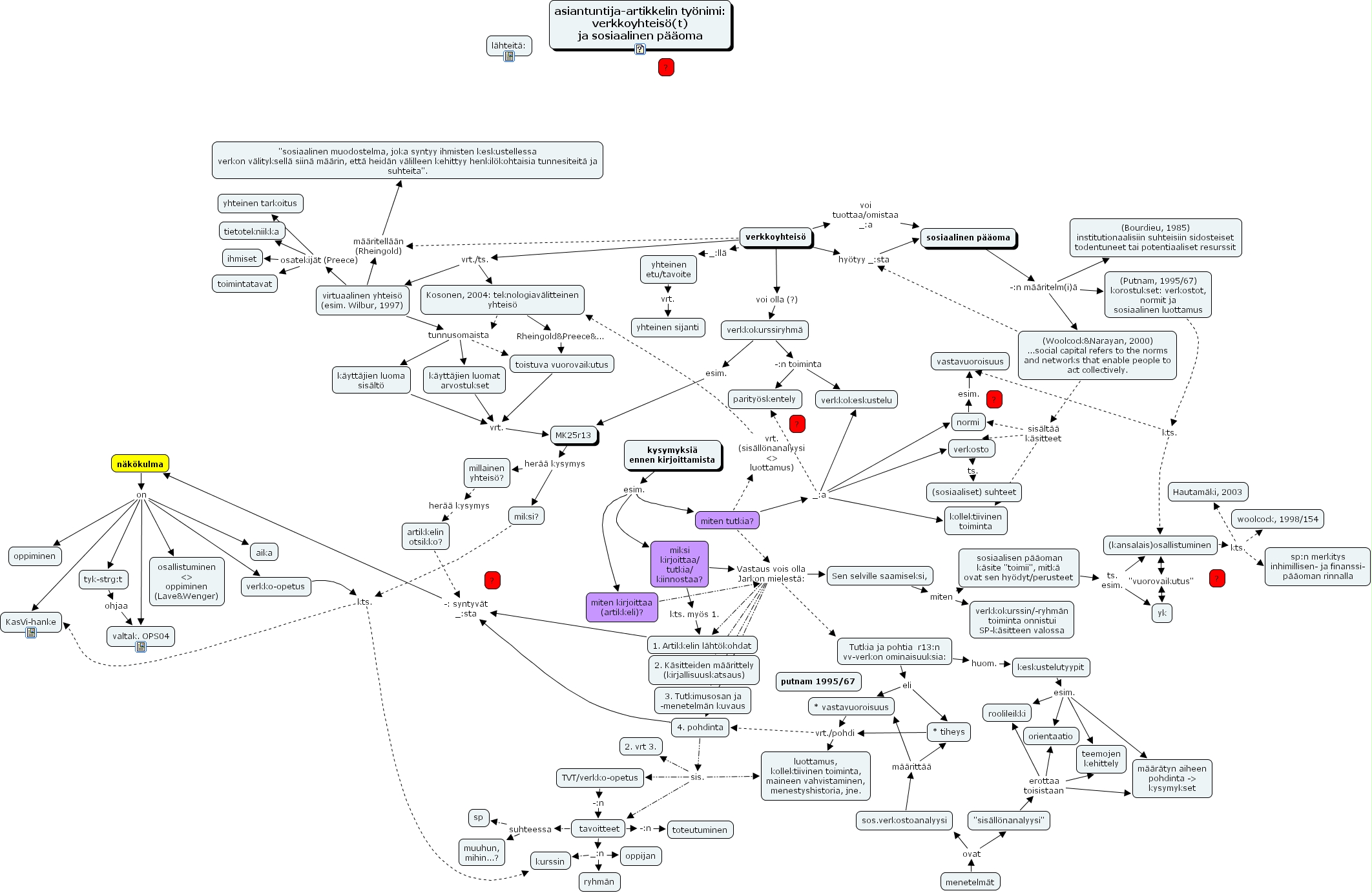 miten kirjoittaa (artikkeli)? Vastaus vois olla Jarkon mielestä: 1. Artikkelin lähtökohdat, näkökulma on verkko-opetus, miten tutkia? _:a verkosto, miten kirjoittaa (artikkeli)? Vastaus vois olla Jarkon mielestä: 4. pohdinta, miten tutkia? Vastaus vois olla Jarkon mielestä: 4. pohdinta, miksi kirjoittaa/ tutkia/ kiinnostaa? Vastaus vois olla Jarkon mielestä: 4. pohdinta, 4. pohdinta sis. 2. vrt 3., verkkoyhteisö vrt./ts. Kosonen, 2004: teknologiavälitteinen yhteisö, * vastavuoroisuus vrt./pohdi luottamus, kollektiivinen toiminta, maineen vahvistaminen, menestyshistoria, jne., (kansalais)osallistuminen kts. woolcock, 1998/154, (kansalais)osallistuminen "vuorovaikutus" yk, (Woolcock&Narayan, 2000) ...social capital refers to the norms and networks that enable people to act collectively. hyötyy _:sta sosiaalinen pääoma, miten tutkia? Vastaus vois olla Jarkon mielestä: 1. Artikkelin lähtökohdat, "sisällönanalyysi" erottaa toisistaan määrätyn aiheen pohdinta -> kysymykset, Kosonen, 2004: teknologiavälitteinen yhteisö tunnusomaista käyttäjien luomat arvostukset, miten tutkia? vrt. (sisällönanalyysi <> luottamus) Kosonen, 2004: teknologiavälitteinen yhteisö, verkosto ts. (sosiaaliset) suhteet, näkökulma on KasVi-hanke, virtuaalinen yhteisö (esim. Wilbur, 1997) tunnusomaista käyttäjien luoma sisältö, (Woolcock&Narayan, 2000) ...social capital refers to the norms and networks that enable people to act collectively. sisältää käsitteet kollektiivinen toiminta, millainen yhteisö? herää kysymys artikkelin otsikko?, verkkoyhteisö voi olla (?) verkkokurssiryhmä, "sisällönanalyysi" erottaa toisistaan orientaatio, tavoitteet _:n ryhmän, näkökulma on valtak. OPS04, Kosonen, 2004: teknologiavälitteinen yhteisö tunnusomaista käyttäjien luoma sisältö, 4. pohdinta sis. TVT/verkko-opetus, käyttäjien luomat arvostukset vrt. MK25r13, verkkoyhteisö _:llä yhteinen etu/tavoite, näkökulma on oppiminen, miksi? kts. KasVi-hanke, näkökulma on tyk-strg:t, Sen selville saamiseksi, miten verkkokurssin/-ryhmän toiminta onnistui SP-käsitteen valossa, miten tutkia? _:a parityöskentely, sosiaalinen pääoma -:n määritelm(i)ä (Putnam, 1995/67) korostukset: verkostot, normit ja sosiaalinen luottamus, miten tutkia? _:a verkkokeskustelu, virtuaalinen yhteisö (esim. Wilbur, 1997) osatekijät (Preece) ihmiset, 4. pohdinta -: syntyvät _:sta näkökulma, kysymyksiä ennen kirjoittamista esim. miten kirjoittaa (artikkeli)?, miten tutkia? _:a kollektiivinen toiminta, Tutkia ja pohtia r13:n vv-verkon ominaisuuksia: huom. keskustelutyypit, miten kirjoittaa (artikkeli)? Vastaus vois olla Jarkon mielestä: Tutkia ja pohtia r13:n vv-verkon ominaisuuksia:, keskustelutyypit esim. roolileikki, tavoitteet suhteessa muuhun, mihin...?, sos.verkostoanalyysi määrittää * tiheys, artikkelin otsikko? -: syntyvät _:sta näkökulma, tavoitteet -:n toteutuminen, miten tutkia? Vastaus vois olla Jarkon mielestä: Tutkia ja pohtia r13:n vv-verkon ominaisuuksia:, miksi kirjoittaa/ tutkia/ kiinnostaa? Vastaus vois olla Jarkon mielestä: 3. Tutkimusosan ja -menetelmän kuvaus, sosiaalinen pääoma -:n määritelm(i)ä (Bourdieu, 1985) institutionaalisiin suhteisiin sidosteiset todentuneet tai potentiaaliset resurssit, * tiheys vrt./pohdi 4. pohdinta, tavoitteet _:n oppijan, miten tutkia? Vastaus vois olla Jarkon mielestä: 3. Tutkimusosan ja -menetelmän kuvaus, miten tutkia? _:a normi, MK25r13 herää kysymys miksi?, miksi? kts. kurssin, verkkoyhteisö määritellään (Rheingold) "sosiaalinen muodostelma, joka syntyy ihmisten keskustellessa verkon välityksellä siinä määrin, että heidän välilleen kehittyy henkilökohtaisia tunnesiteitä ja suhteita"., verkkoyhteisö vrt./ts. virtuaalinen yhteisö (esim. Wilbur, 1997), tavoitteet suhteessa sp, "sisällönanalyysi" erottaa toisistaan teemojen kehittely, kysymyksiä ennen kirjoittamista esim. miten tutkia?, toistuva vuorovaikutus vrt. MK25r13, Tutkia ja pohtia r13:n vv-verkon ominaisuuksia: eli * tiheys, tyk-strg:t ohjaa valtak. OPS04, virtuaalinen yhteisö (esim. Wilbur, 1997) osatekijät (Preece) tietotekniikka, verkko-opetus kts. kurssin, miksi kirjoittaa/ tutkia/ kiinnostaa? Vastaus vois olla Jarkon mielestä: 1. Artikkelin lähtökohdat, verkko-opetus kts. KasVi-hanke, miten kirjoittaa (artikkeli)? Vastaus vois olla Jarkon mielestä: 2. Käsitteiden määrittely (kirjallisuuskatsaus), miksi kirjoittaa/ tutkia/ kiinnostaa? Vastaus vois olla Jarkon mielestä: 2. Käsitteiden määrittely (kirjallisuuskatsaus), 1. Artikkelin lähtökohdat -: syntyvät _:sta näkökulma, virtuaalinen yhteisö (esim. Wilbur, 1997) määritellään (Rheingold) "sosiaalinen muodostelma, joka syntyy ihmisten keskustellessa verkon välityksellä siinä määrin, että heidän välilleen kehittyy henkilökohtaisia tunnesiteitä ja suhteita"., TVT/verkko-opetus -:n tavoitteet, miten kirjoittaa (artikkeli)? Vastaus vois olla Jarkon mielestä: 3. Tutkimusosan ja -menetelmän kuvaus, miten tutkia? Vastaus vois olla Jarkon mielestä: 2. Käsitteiden määrittely (kirjallisuuskatsaus), virtuaalinen yhteisö (esim. Wilbur, 1997) tunnusomaista toistuva vuorovaikutus, miten kirjoittaa (artikkeli)? Vastaus vois olla Jarkon mielestä: Sen selville saamiseksi,, (kansalais)osallistuminen kts. sp:n merkitys inhimillisen- ja finanssi- pääoman rinnalla, miten tutkia? vrt. (sisällönanalyysi <> luottamus) Kosonen, 2004: teknologiavälitteinen yhteisö, "sisällönanalyysi" erottaa toisistaan roolileikki, verkkokurssiryhmä -:n toiminta parityöskentely, menetelmät ovat sos.verkostoanalyysi, näkökulma on aika, Kosonen, 2004: teknologiavälitteinen yhteisö tunnusomaista toistuva vuorovaikutus, normi esim. vastavuoroisuus, Tutkia ja pohtia r13:n vv-verkon ominaisuuksia: eli * vastavuoroisuus, verkkoyhteisö hyötyy _:sta sosiaalinen pääoma, virtuaalinen yhteisö (esim. Wilbur, 1997) osatekijät (Preece) toimintatavat, (Woolcock&Narayan, 2000) ...social capital