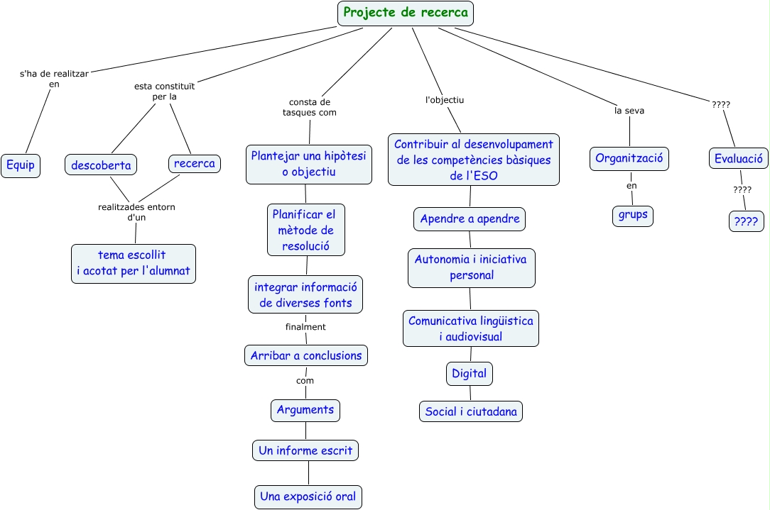 Este Cmap, tiene información relacionada con: Treball de recerca, Arguments ???? Un informe escrit, Planificar el mètode de resolució ???? integrar informació de diverses fonts, Apendre a apendre ???? Autonomia i iniciativa personal, Contribuir al desenvolupament de les competències bàsiques de l'ESO ???? Apendre a apendre, descoberta realitzades entorn d'un tema escollit i acotat per l'alumnat, Autonomia i iniciativa personal ???? Comunicativa lingüistica i audiovisual, Projecte de recerca consta de tasques com Plantejar una hipòtesi o objectiu, Projecte de recerca s'ha de realitzar en Equip, Projecte de recerca esta constituït per la descoberta, Arribar a conclusions com Arguments, Projecte de recerca la seva Organització, Evaluació ???? ????, recerca realitzades entorn d'un tema escollit i acotat per l'alumnat, integrar informació de diverses fonts finalment Arribar a conclusions, Plantejar una hipòtesi o objectiu ???? Planificar el mètode de resolució, Projecte de recerca esta constituït per la recerca, Digital ???? Social i ciutadana, Comunicativa lingüistica i audiovisual ???? Digital, Organització en grups, Projecte de recerca l'objectiu Contribuir al desenvolupament de les competències bàsiques de l'ESO
