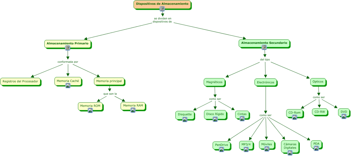 Este Cmap, tiene información relacionada con: Dispositivos de almacenamiento, Dispositivos de Almacenamiento se dividen en dispositivos de Almacenamiento Secundario, Almacenamiento Primario conformada por Memoria principal, Almacenamiento Primario conformada por Registros del Procesador, Opticos como ser DVD, Electrónicos como ser MP3/4, Almacenamiento Secundario del tipo Opticos, Electrónicos como ser Cámaras Digitales, Electrónicos como ser PDA, Opticos como ser CD-RW, Magnéticos como ser Disco Rígido, Almacenamiento Secundario del tipo Magnéticos, Dispositivos de Almacenamiento se dividen en dispositivos de Almacenamiento Primario, Magnéticos como ser Disquette, Magnéticos como ser Cintas, Electrónicos como ser Móviles, Memoria principal que son la Memoria RAM, Almacenamiento Secundario del tipo Electrónicos, Opticos como ser CD-Rom, Memoria principal que son la Memoria ROM, Almacenamiento Primario conformada por Memoria Caché