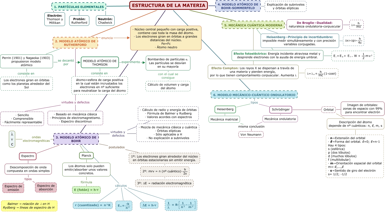 en órbitas estacionarias sin emitir energía. </mtext> </mrow> </math> <math xmlns="http://www.w3.org/1998/Math/MathML"> <mrow> <mtext> 2º: mrv = n (nº cuántico)· </mtext> <mfrac> <mtext> h </mtext> <mtext> 2π </mtext> </mfrac> </mrow> </math>, Efecto Compton: Los rayos X se dispersan a través de una materia y pierden energía, por lo que tienen comportamiento corpuscular. Aumenta λ <math xmlns="http://www.w3.org/1998/Math/MathML"> <mrow> <mtext> λ= </mtext> <mmultiscripts> <mtext> λ </mtext> <mtext> o </mtext> <none/> </mmultiscripts> <mtext> + </mtext> <mfrac> <mtext> h </mtext> <mtext> mc </mtext> </mfrac> <mtext> (1-cosθ) </mtext> </mrow> </math>, 5. MECÁNICA CUÁNTICA MODERNA Efecto Compton: Los rayos X se dispersan a través de una materia y pierden energía, por lo que tienen comportamiento corpuscular. Aumenta λ, Descripción del átomo depende de nº cuánticos: n, ℓ, m, s · n→Extensión del orbital · ℓ→Forma del orbital. ℓ=0; ℓ=n-1 Hay 4 tipos: s (esférica) p (dos lóbulos) d (muchos lóbulos) f (multilobular) · m→Orientación espacial del orbital m=-ℓ,...,ℓ · s→Sentido de giro del electrón s= 1/2; -1/2, <math xmlns="http://www.w3.org/1998/Math/MathML"> <mrow> <mtext> r (cuantizado) = </mtext> <mmultiscripts> <mtext> n </mtext> <none/> <mtext> 2 </mtext> </mmultiscripts> <mtext> K </mtext> </mrow> </math> cálculos ΔE = h·ν, 3. MODELO ATÓMICO DE BOHR postulados <math xmlns="http://www.w3.org/1998/Math/MathML"> <mrow> <mtext> 1º: Los electrones giran alrededor del núcleo