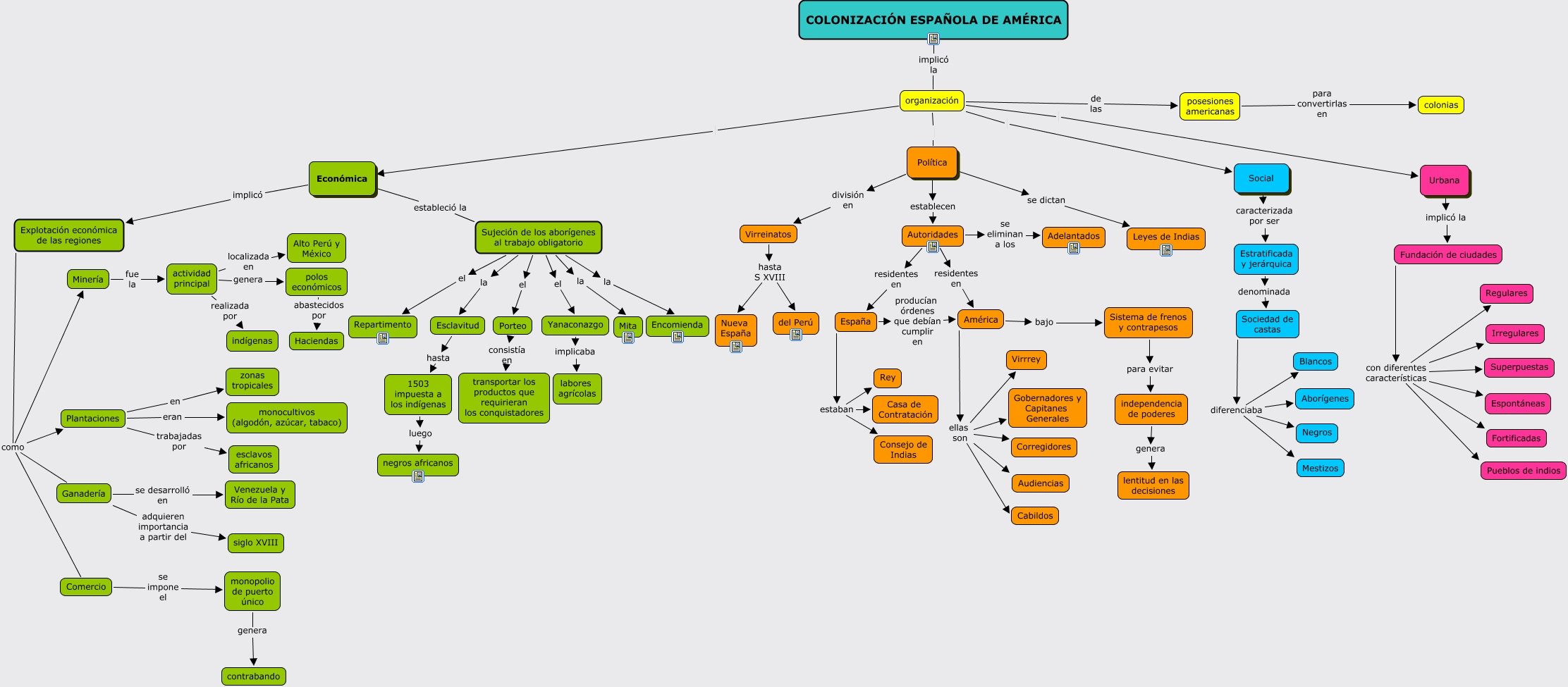Este Cmap, tiene información relacionada con: Colonización española de América, Fundación de ciudades con diferentes características Irregulares, Sujeción de los aborígenes al trabajo obligatorio el Repartimento, Urbana implicó la Fundación de ciudades, polos económicos abastecidos por Haciendas, Yanaconazgo implicaba labores agrícolas, Sujeción de los aborígenes al trabajo obligatorio la Encomienda, Fundación de ciudades con diferentes características Superpuestas, Fundación de ciudades con diferentes características Fortificadas, Autoridades residentes en España, América ellas son Corregidores, Explotación económica de las regiones como Plantaciones, 1503 impuesta a los indígenas luego negros africanos, organización Urbana, Fundación de ciudades con diferentes características Regulares, España producían órdenes que debían cumplir en América, Sistema de frenos y contrapesos para evitar independencia de poderes, Explotación económica de las regiones como Ganadería, América ellas son Gobernadores y Capitanes Generales, América ellas son Cabildos, Plantaciones trabajadas por esclavos africanos
