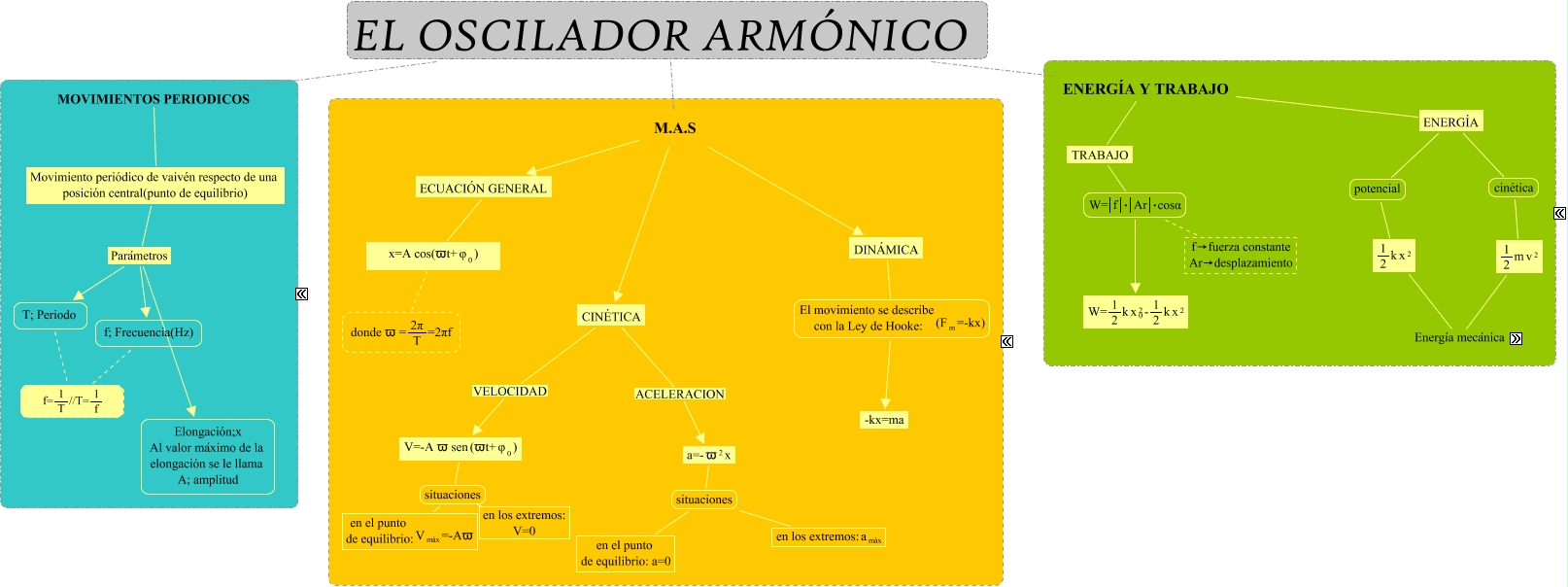 de equilibrio: </mtext> <mmultiscripts> <mtext> V </mtext> <mtext> máx </mtext> <none/> </mmultiscripts> <mtext> =-Aϖ </mtext> </mrow> </math>, ENERGÍA potencial <math xmlns="http://www.w3.org/1998/Math/MathML"> <mrow> <mfrac> <mtext> 1 </mtext> <mtext> 2 </mtext> </mfrac> <mtext> k </mtext> <mmultiscripts> <mtext> x </mtext> <none/> <mtext> 2 </mtext> </mmultiscripts> </mrow> </math>, EL OSCILADOR ARMÓNICO M.A.S ECUACIÓN GENERAL, CINÉTICA VELOCIDAD <math xmlns="http://www.w3.org/1998/Math/MathML"> <mrow> <mtext> V=-A ϖ sen </mtext> <mrow> <mtext> (ϖt+ </mtext> <mmultiscripts> <mtext> φ </mtext> <mtext> 0 </mtext> <none/> </mmultiscripts> <mtext> ) </mtext> </mrow> </mrow> </math>, Movimiento periódico de vaivén respecto de una posición central(punto de equilibrio) Parámetros T; Periodo, ENERGÍA cinética <math xmlns="http://www.w3.org/1998/Math/MathML"> <mrow> <mfrac> <mtext> 1 </mtext> <mtext> 2 </mtext> </mfrac> <mtext> m </mtext> <mmultiscripts> <mtext> v </mtext> <none/> <mtext> 2 </mtext> </mmultiscripts> </mrow> </math>, EL OSCILADOR ARMÓNICO ENERGÍA Y TRABAJO TRABAJO