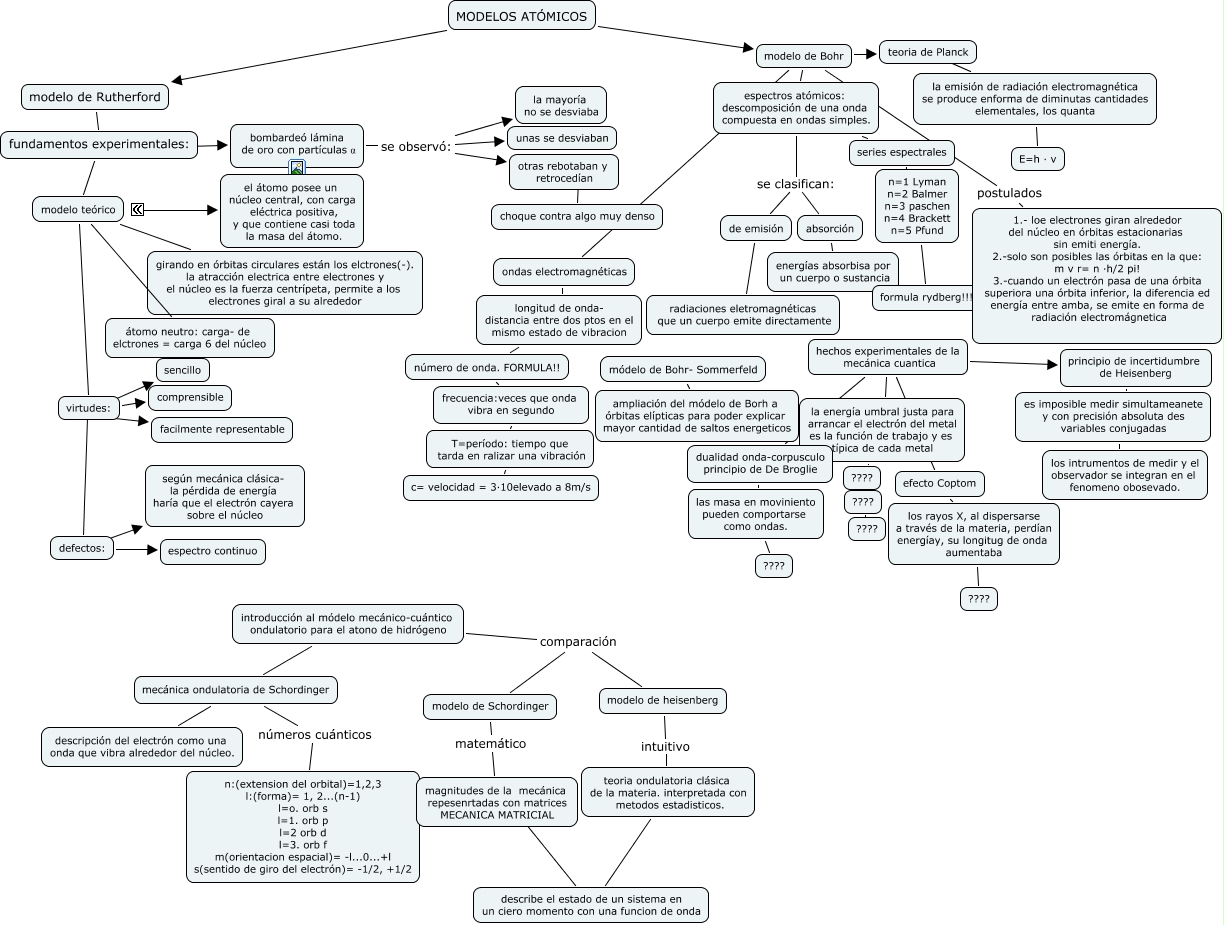 Este Cmap, tiene información relacionada con: modelos atomicos maria tasa, teoria de Planck ???? la emisión de radiación electromagnética se produce enforma de diminutas cantidades elementales, los quanta, defectos: ???? según mecánica clásica- la pérdida de energía haría que el electrón cayera sobre el núcleo, modelo de heisenberg intuitivo teoria ondulatoria clásica de la materia. interpretada con metodos estadisticos., bombardeó lámina de oro con partículas α se observó: otras rebotaban y retrocedían, de emisión radiaciones eletromagnéticas que un cuerpo emite directamente, MODELOS ATÓMICOS modelo de Rutherford, series espectrales n=1 Lyman n=2 Balmer n=3 paschen n=4 Brackett n=5 Pfund, modelo teórico ???? el átomo posee un núcleo central, con carga eléctrica positiva, y que contiene casi toda la masa del átomo., bombardeó lámina de oro con partículas α se observó: unas se desviaban, virtudes: comprensible, ???? ????, módelo de Bohr- Sommerfeld ampliación del módelo de Borh a órbitas elípticas para poder explicar mayor cantidad de saltos energeticos, principio de incertidumbre de Heisenberg es imposible medir simultameanete y con precisión absoluta des variables conjugadas, hechos experimentales de la mecánica cuantica dualidad onda-corpusculo principio de De Broglie, otras rebotaban y retrocedían ???? choque contra algo muy denso, espectros atómicos: descomposición de una onda compuesta en ondas simples. se clasifican: de emisión, longitud de onda- distancia entre dos ptos en el mismo estado de vibracion número de onda. FORMULA!!, modelo de Bohr postulados 1.- loe electrones giran alrededor del núcleo en órbitas estacionarias sin emiti energía. 2.-solo son posibles las órbitas en la que: m v r= n ·h/2 pi! 3.-cuando un electrón pasa de una órbita superiora una órbita inferior, la diferencia ed energía entre amba, se emite en forma de radiación electromágnetica, defectos: espectro continuo, introducción al módelo mecánico-cuántico ondulatorio para el atono de hidrógeno comparación modelo de Schordinger