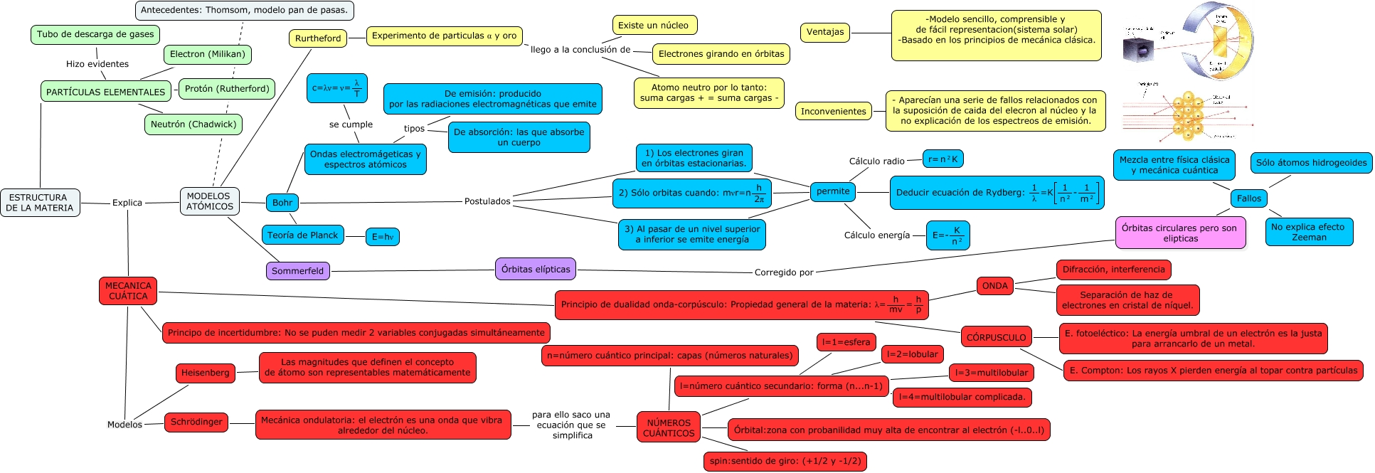 Este Cmap, tiene información relacionada con: Estructura de la materia, Héctor Balastegui, MECANICA CUÁTICA Principo de incertidumbre: No se puden medir 2 variables conjugadas simultáneamente, 1) Los electrones giran en órbitas estacionarias. permite, Teoría de Planck E=hν, PARTÍCULAS ELEMENTALES Electron (Milikan), MODELOS ATÓMICOS Antecedentes: Thomsom, modelo pan de pasas., Experimento de particulas α y oro llego a la conclusión de Existe un núcleo, Experimento de particulas α y oro llego a la conclusión de Atomo neutro por lo tanto: suma cargas + = suma cargas -, Bohr Postulados 1) Los electrones giran en órbitas estacionarias., NÚMEROS CUÁNTICOS n=número cuántico principal: capas (números naturales), permite Cálculo energía <math xmlns="http://www.w3.org/1998/Math/MathML"> <mrow> <mtext> E=- </mtext> <mfrac> <mtext> K </mtext> <mrow> <mmultiscripts> <mtext> n </mtext> <none/> <mtext> 2 </mtext> </mmultiscripts> </mrow> </mfrac> </mrow> </math>, <math xmlns="http://www.w3.org/1998/Math/MathML"> <mrow> <mtext> 2) Sólo orbitas cuando: mνr=n </mtext> <mfrac> <mtext> h </mtext> <mtext> 2π </mtext> </mfrac> </mrow> </math> permite, permite Cálculo radio <math xmlns="http://www.w3.org/1998/Math/MathML"> <mrow> <mtext> r= </mtext> <mmultiscripts> <mtext> n </mtext> <none/> <mtext> 2 </mtext> </mmultiscripts> <mtext> K </mtext> </mrow> </math>, Schrödinger Mecánica ondulatoria: el electrón es una onda que vibra alrededor del núcleo., ESTRUCTURA DE LA MATERIA Explica MECANICA CUÁTICA, MODELOS ATÓMICOS ???? Sommerfeld, Bohr Postulados 3) Al pasar de un nivel superior a inferior se emite energía, <math xmlns="http://www.w3.org/1998/Math/MathML"> <mrow> <mtext> Principio de dualidad onda-corpúsculo: Propiedad general de la materia: λ= </mtext> <mfrac> <mtext> h </mtext> <mtext> mv </mtext> </mfrac> <mtext> = </mtext> <mfrac> <mtext> h </mtext> <mtext> p </mtext> </mfrac> </mrow> </math> CÓRPUSCULO, Ondas electromágeticas y espectros atómicos tipos De emisión: producido por las radiaciones electromagnéticas que emite, Sommerfeld Órbitas elípticas, l=número cuántico secundario: forma (n...n-1) l=4=multilobular complicada.